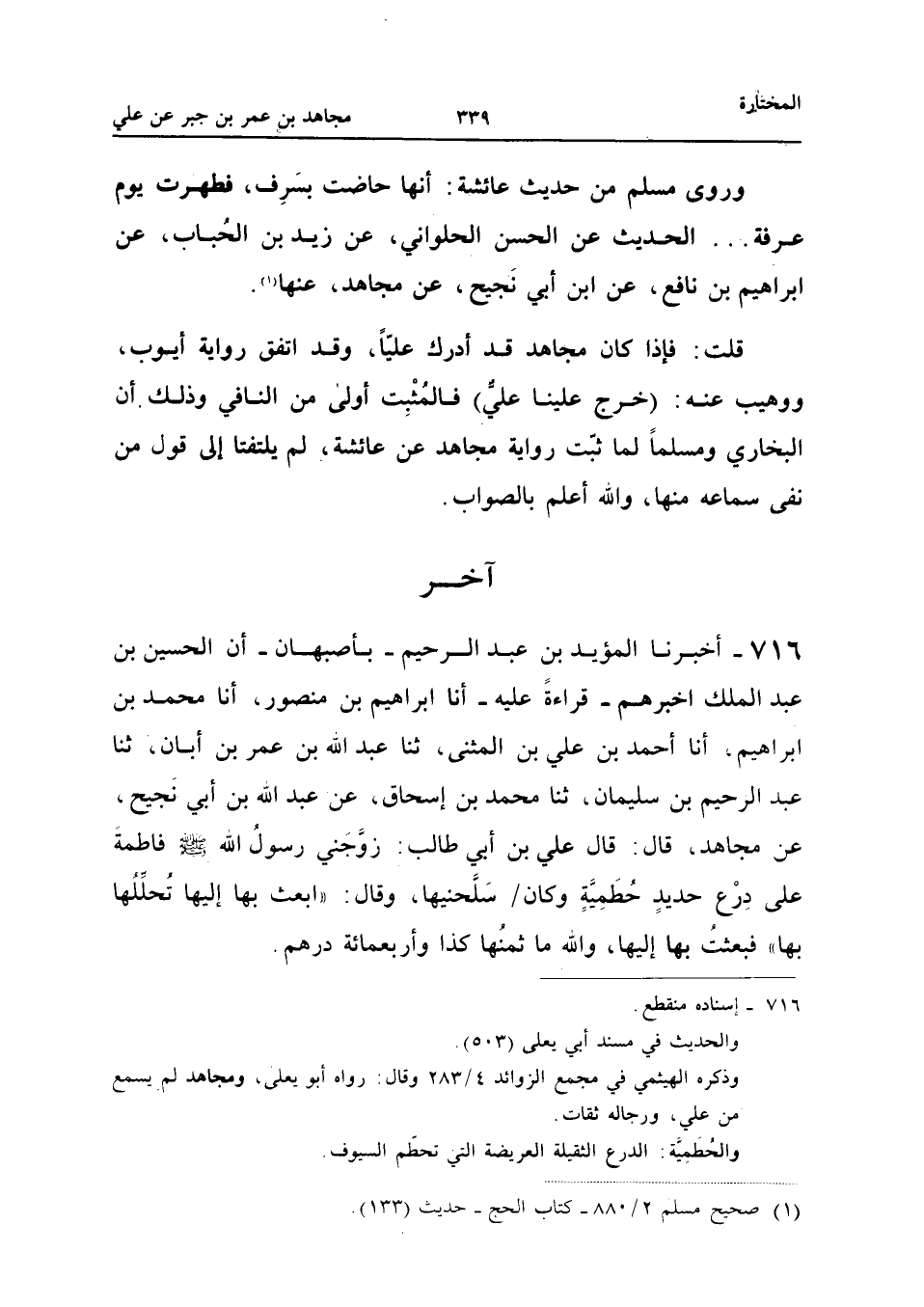 وَرَوَى مُسْلِمٌ مِنْ حَدِيثِ عَائِشَةَ أَنَّهَا حَاضَتْ بِسَرِفٍ فَطَهَرَتْ يَوْمَ عَرَفَةَ الْحَدِيثَ عَنِ الْحَسَنِ الْحُلْوَانِيِّ عَنْ زَيْدِ بْنِ الْحُبَابِ عَنْ إِبْرَاهِيمَ بْنِ نَافِعٍ عَنِ ابْنِ أَبِي نَجِيحٍ عَنْ مُجَاهِدٍ عَنْهَا قُلْتُ فَإِذَا كَانَ مُجَاهِدٌ قَدْ أَدْرَكَ عَلِيًّا وَقَدِ اتَّفَقَ رِوَايَةُ أَيُّوبَ وَوُهَيْبٍ عَنْهُ (خَرَجَ عَلَيْنَا عَلِيٌّ) فَالْمُثْبِتُ أَوْلَى مِنَ النَّافِي وَذَلِكَ أَنَّ الْبُخَارِيَّ وَمُسْلِمًا لَمَّا ثَبَتَ رِوَايَةُ مُجَاهِدٍ عَنْ عَائِشَةَ لَمْ يَلْتَفِتَا إِلَى قَوْلِ مَنْ نَفَى سَمَاعَهُ مِنْهَا وَاللَّهُ أَعْلَمُ بِالصَّوَابِ (إِسْنَاده مُنْقَطع)