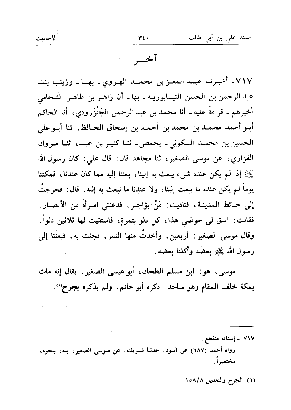717 - أخبرنَا عبد الْمعز بن مُحَمَّد الْهَرَوِيّ بهَا وَزَيْنَب بنت عبد الرَّحْمَن بن الْحسن النيسابورية بِهَا أَنَّ زَاهِرَ بْنَ طَاهِرٍ الشَّحَّامِيَّ أَخْبَرَهُمْ قِرَاءَة عَلَيْهِ أَنا مُحَمَّد بن عبد الرَّحْمَن الْجَنْزَرُودِيُّ أَنَا الْحَاكِمُ أَبُو أَحْمَدَ مُحَمَّدُ بْنُ مُحَمَّدِ بْنِ أَحْمَدَ بْنِ إِسْحَاقَ الْحَافِظُ ثَنَا أَبُو عَلِيٍّ الْحُسَيْنُ بْنُ مُحَمَّدٍ السَّكُونِيُّ بِحِمْصَ ثَنَا كَثِيرُ بْنُ عَبْدٍ ثَنَا مَرْوَانُ الْفَزَارِيُّ عَنْ مُوسَى الصَّغِيرِ ثَنَا مُجَاهِدٌ قَالَ قَالَ عَلِيٌّ كَانَ رَسُولُ اللَّهِ صَلَّى اللَّه عَلَيْهِ وَسَلَّمَ إِذَا لَمْ يَكُنْ عِنْدَهُ شَيْءٌ يَبْعَثُ بِهِ إِلَيْنَا بَعَثْنَا إِلَيْهِ مِمَّا كَانَ عِنْدَنَا فَمَكَثْنَا يَوْمًا لَمْ يَكُنْ عِنْدَهُ مَا يَبْعَثُ إِلَيْنَا وَلَا عندنَا منا نَبْعَثُ بِهِ إِلَيْهِ قَالَ فَخَرَجْتُ إِلَى حَائِطِ الْمَدِينَةِ فَنَادَيْتُ مَنْ يُؤَاجِرُ فَدَعَتْنِي امْرَأَةٌ مِنَ الأَنْصَارِ فَقَالَتْ اسْقِ لِي حَوْضِي هَذَا كُلَّ دَلْوٍ بِتَمْرَةٍ فَاسْتَقَيْتُ لَهَا ثَلاثِينَ دَلْوًا وَقَالَ مُوسَى الصَّغِيرُ أَرْبَعِينَ وَأَخَذْتُ مِنْهَا التَّمْرَ فَجِئْتُ بِهِ فَبَعَثْنَا إِلَى رَسُولِ اللَّهِ صَلَّى اللَّه عَلَيْهِ وَسَلَّمَ بَعْضَهُ وَأَكَلْنَا بَعْضَهُ