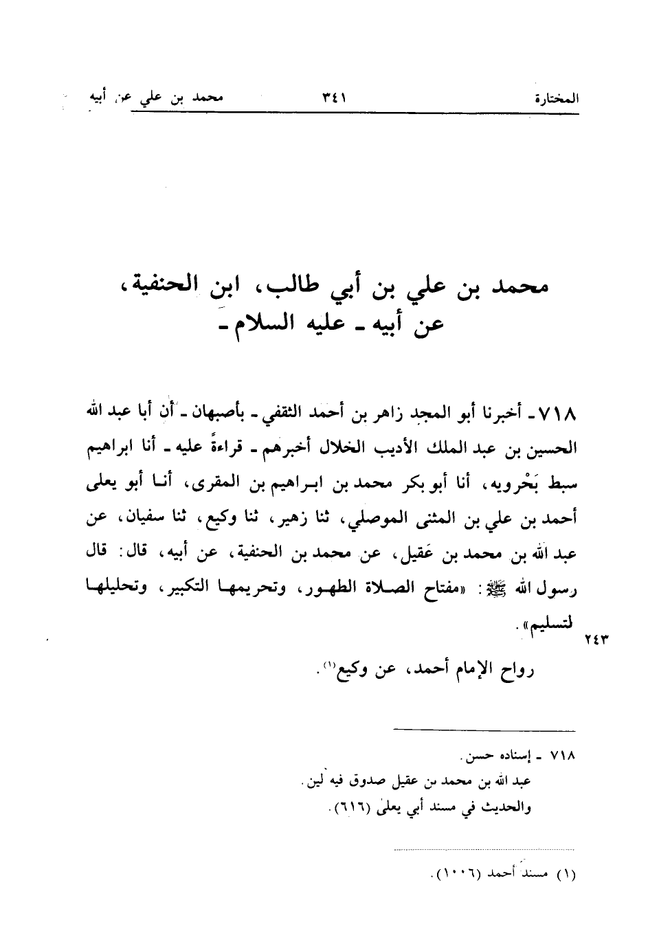 718 - أَخْبَرَنَا أَبُو الْمَجْدِ زَاهِرُ بْنُ أَحْمَدَ الثَّقَفِيُّ بِأَصْبَهَانَ أَن أَبَا عبد الله الْحُسَيْن بن عبد الْملك الأَدِيبَ الْخَلَّالَ أَخْبَرَهُمْ قِرَاءَةً عَلَيْهِ أَنَا إِبْرَاهِيمُ سِبْطُ بَحْرُوَيْهِ أَنَا أَبُو بَكْرٍ مُحَمَّدُ بْنُ إِبْرَاهِيم بن الْمُقْرِي أَنا أَبُو يَعْلَى أَحْمَدُ بْنُ عَلِيِّ بْنِ الْمُثَنَّى الْمَوْصِلِيُّ ثَنَا زُهَيْرٌ ثَنَا وَكِيعٌ ثَنَا سُفْيَان عَن عبد الله بْنُ مُحَمَّدِ بْنِ عُقَيْلٍ عَنْ مُحَمَّدِ بْنِ الْحَنَفِيَّةِ عَنْ أَبِيهِ قَالَ قَالَ رَسُولُ اللَّهِ صَلَّى اللَّه عَلَيْهِ وَسَلَّمَ مِفْتَاحُ الصَّلاةِ الطُّهُورُ وَتَحْرِيمُهَا التَّكْبِيرُ وَتَحْلِيلُهَا التَّسْلِيمُ