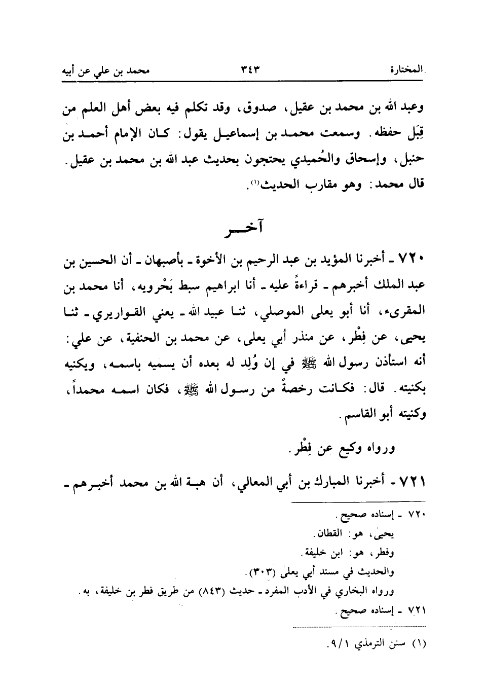 720 - أخبرنَا الْمُؤَيد بن عبد الرَّحِيم بن الْأُخوة بأصبهان أَن الْحُسَيْن بن عبد الْملك أَخْبَرَهُمْ قِرَاءَةً عَلَيْهِ أَنا إِبْرَاهِيمُ سِبْطُ بَحْرُوَيْهِ أَنا مُحَمَّد بن الْمُقْرِئ أَنا أَبُو يعلى الْموصِلِي ثَنَا عبيد الله يَعْنِي الْقَوَارِيرِيَّ ثَنَا يَحْيَى عَنْ فِطْرٍ عَنْ مُنْذر أبي يعلى عَن مُحَمَّد بن الْحَنَفِيَّةِ عَنْ عَلِيٍّ أَنَّهُ اسْتَأْذَنَ رَسُولَ اللَّهِ صَلَّى اللَّه عَلَيْهِ وَسَلَّمَ فِي إِنْ وُلِدَ لَهُ بَعْدَهُ أَنْ يُسَمِّيَهُ بِاسْمِهِ وَيُكَنِّيَهُ بِكُنْيَتِهِ قَالَ فَكَانَتْ رُخْصَةً مِنْ رَسُولِ اللَّهِ صَلَّى اللَّه عَلَيْهِ وَسَلَّمَ فَكَانَ اسْمُهُ مُحَمَّدًا وَكُنْيَتُهُ أَبُو الْقَاسِم