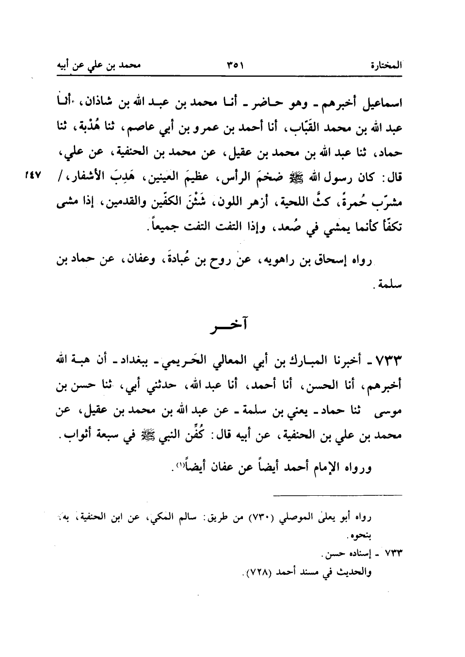 733 - أَخْبَرَنَا الْمُبَارَكُ بْنُ أَبِي الْمَعَالِي الْحَرِيمِيُّ بِبَغْدَادَ أَنَّ هِبَةَ اللَّهِ أَخْبَرَهُمْ أَنَا الْحَسَنُ أَنا أَحْمد أَنا عبد الله حَدَّثَنِي أَبِي ثَنَا حَسَنُ بْنُ مُوسَى ثَنَا حَمَّاد يَعْنِي بن سَلمَة عَن عبد الله بْنُ مُحَمَّدِ بْنِ عُقَيْلٍ عَنْ مُحَمَّدِ بْنِ عَلِيِّ بْنِ الْحَنَفِيَّةِ عَنْ أَبِيهِ قَالَ كُفِّنَ النَّبِيُّ صَلَّى اللَّه عَلَيْهِ وَسَلَّمَ فِي سَبْعَةِ أَثْوَابٍ