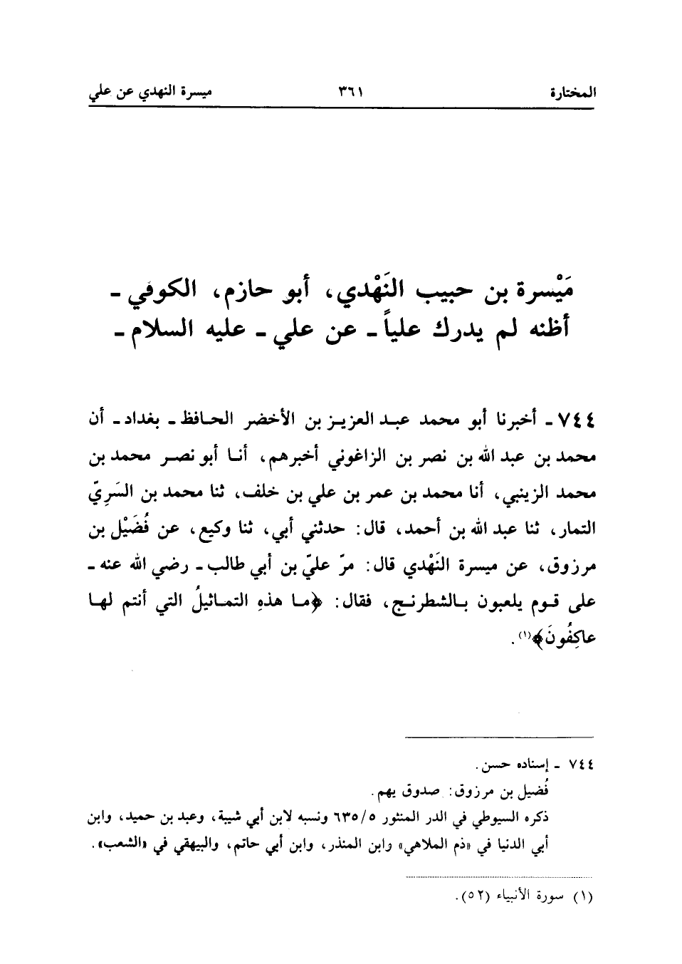 744 - أخبرنَا أَبُو مُحَمَّد عبد الْعَزِيز بْنُ الأَخْضَرِ الْحَافِظُ بِبَغْدَادَ أَنَّ مُحَمَّدَ بْنَ عبد الله بْنِ نَصْرِ بْنِ الزَّاغُونِيِّ أَخْبَرَهُمْ أَنَا أَبُو نَصْرٍ مُحَمَّدُ بْنُ مُحَمَّدٍ الزَّيْنَبِيُّ أَنَا مُحَمَّدُ بْنُ عُمَرَ بْنِ عَلِيِّ بْنِ خَلَفٍ ثَنَا مُحَمَّد بن السّري التمار ثَنَا عبد الله بْنُ أَحْمَدَ قَالَ حَدَّثَنِي أَبِي ثَنَا وَكِيعٌ عَنْ فُضَيْلِ بْنِ مَرْزُوقٍ عَنْ مَيْسَرَةَ النَّهْدِيِّ قَالَ مَرَّ عَلِيُّ بْنُ أَبِي طَالِبٍ رَضِيَ اللَّهُ عَنْهُ عَلَى قَوْمٍ يَلْعَبُونَ بِالشَّطْرَنْجِ فَقَالَ {مَا هَذِهِ التَّمَاثِيلُ الَّتِي أَنْتُمْ لَهَا عَاكِفُونَ} إِسْنَاده حسن نَاجِيَةُ بْنُ كَعْبٍ الْعَنْبَرِيُّ وَقِيلَ الأَسَدِيُّ عَنْ عَليّ عَلَيْهِ السَّلَام