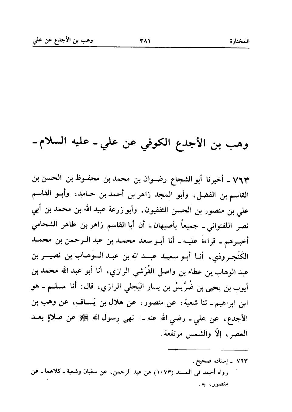 763 - أَخْبَرَنَا أَبُو الشُّجَاعِ رِضْوَانُ بْنُ مُحَمَّدِ بْنِ مَحْفُوظِ بْنِ الْحَسَنِ بْنِ الْقَاسِمِ بْنِ الْفَضْلِ وَأَبُو الْمَجْدِ زَاهِرُ بْنُ أَحْمَدَ بْنِ حَامِدٍ وَأَبُو الْقَاسِمِ عَلِيُّ بْنُ مَنْصُورِ بْنِ الْحسن الثقفيون وَأَبُو زرْعَة عبيد الله بْنُ مُحَمَّدِ بْنِ أَبِي نَصْرٍ اللَّفْتُوَانِيُّ جَمِيعًا بِأَصْبَهَانَ أَنَّ أَبَا الْقَاسِمِ زَاهِرَ بْنَ طَاهِرٍ الشَّحَّامِيَّ أَخْبَرَهُمْ قِرَاءَةً عَلَيْهِ أَنَا أَبُو سَعْدٍ مُحَمَّد بن عبد الرَّحْمَن بن مُحَمَّد الكنجروذي أَنا أَبُو سعيد عبد الله بن عبد الْوَهَّاب بن نصير بن عبد الْوَهَّاب بْنِ عَطَاءِ بْنِ وَاصِلٍ الْقُرَشِيُّ الرَّازِيُّ أَنَا أَبُو عبد الله مُحَمَّدُ بْنُ أَيُّوبَ بْنِ يَحْيَى بْنِ ضُرَيْسِ بْنِ يَسَارٍ الْبَجَلِيُّ الرَّازِيُّ قَالَ أَنَا مُسْلِمٌ هُوَ ابْنُ إِبْرَاهِيمَ ثَنَا شُعْبَةُ عَنْ مَنْصُورٍ عَنْ هِلالِ بْنِ يَسَافٍ عَنْ وَهْبِ بْنِ الأَجْدَعِ عَنْ عَلِيٍّ رَضِيَ اللَّهُ عَنْهُ نَهَى رَسُولِ اللَّهِ صَلَّى اللَّهُ عَلَيْهِ وَسَلَّمَ عَنْ صَلَاة بعد الْعَصْر إِلَّا وَالشَّمْس مُرْتَفعَة (إِسْنَاده صَحِيح)