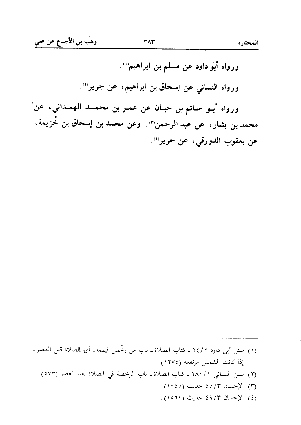 وَرَوَاهُ أَبُو دَاوُدَ عَنْ مُسْلِمِ بْنِ إِبْرَاهِيمَ وَرَوَاهُ النَّسَائِيُّ عَنْ إِسْحَاقَ بْنِ إِبْرَاهِيمَ عَنْ جَرِيرٍ وَرَوَاهُ أَبُو حَاتِمِ بْنُ حِبَّانَ عَنْ عُمَرَ بْنِ مُحَمَّدٍ الْهَمْدَانِيِّ عَنْ مُحَمَّدِ بْنِ بشار عَن عبد الرَّحْمَن وَعَنْ مُحَمَّدِ بْنِ إِسْحَاقَ بْنِ خُزَيْمَةَ عَنْ يَعْقُوب الدَّوْرَقِي عَن جرير (إِسْنَاده صَحِيح)