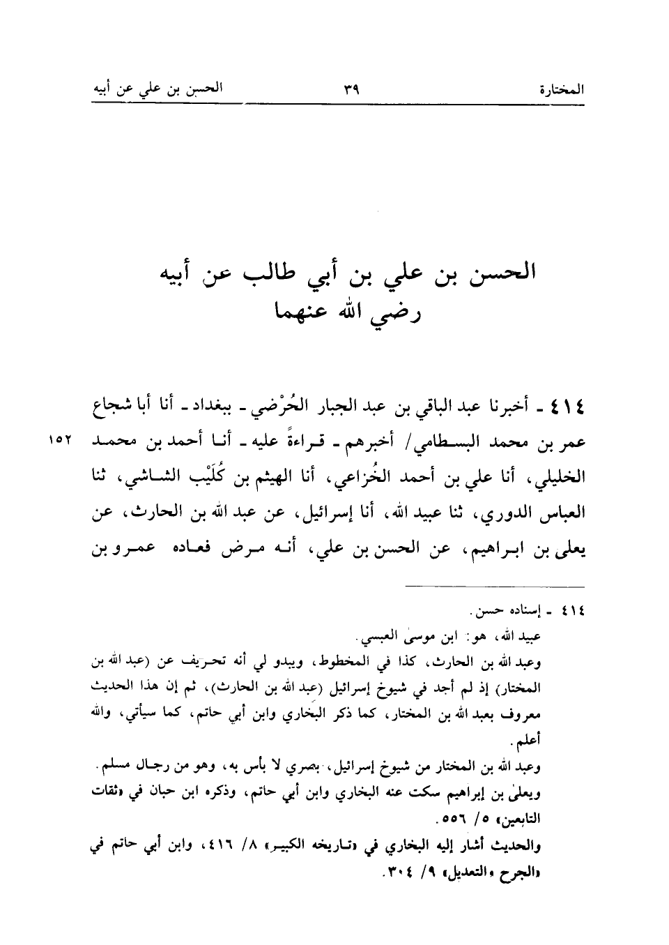 414 - أخبرنَا عبد الْبَاقِي بن عبد الْجَبَّار الحرضي بِبَغْدَادَ أَنَا أَبَا شُجَاعٍ عُمَرَ بْنَ مُحَمَّدٍ الْبَسْطَامِيَّ أَخْبَرَهُمْ قِرَاءَةً عَلَيْهِ أَنا أَحْمَدُ بْنُ مُحَمَّدٍ الْخَلِيلِيُّ أَنا عَلِيُّ بْنُ أَحْمَدَ الْخُزَاعِيُّ أَنَا الْهَيْثَمُ بْنُ كُلَيْبٍ الشَّاشِيُّ ثَنَا الْعَبَّاسُ الدوري ثَنَا عبيد الله أَنا إِسْرَائِيل عَن عبد الله بْنِ الْحَارِثِ عَنْ يَعْلَى بْنِ إِبْرَاهِيمَ عَنِ الْحَسَنِ بْنِ عَلِيٍّ أَنَّهُ مَرِضَ فَعَادَهُ عَمْرُو بن
