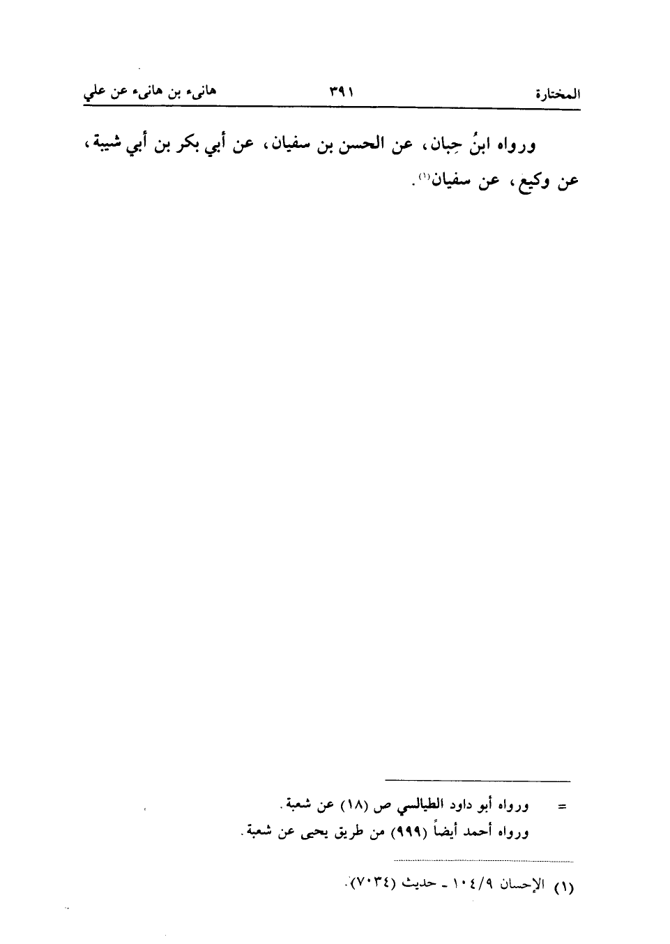 وَرَوَاهُ ابْنُ حِبَّانَ عَنِ الْحَسَنِ بْنِ سُفْيَانَ عَنْ أَبِي بَكْرِ بْنِ أَبِي شَيْبَةَ عَنِ وَكِيع عَن سُفْيَان (إِسْنَاده لَا بَأْس بِهِ)