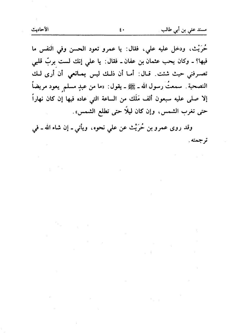حُرَيْثٍ وَدَخَلَ عَلَيْهِ عَلِيٌّ فَقَالَ يَا عَمْرُو تَعُودُ الْحَسَنَ وَفِي النَّفْسِ مَا فِيهَا وَكَانَ يُحِبُّ عُثْمَانَ بْنَ عَفَّانَ فَقَالَ يَا عَلِيُّ إِنَّكَ لَسْتَ بِرَبِّ قَلْبِي تُصَرِّفُنِي حَيْثُ شِئْتَ قَالَ أَمَا أَنَّ ذَلِكَ لَيْسَ بِمَانِعِي أَنْ أَرَى لَكَ النَّصِيحَةَ سَمِعْتُ رَسُولَ اللَّهِ صَلَّى اللَّهُ عَلَيْهِ وَسَلَّمَ يَقُولُ مَا مِنْ عَبْدٍ مُسْلِمٍ يَعُودُ مَرِيضًا إِلَّا صَلَّى عَلَيْهِ سَبْعُونَ أَلْفَ مَلَكٍ مِنَ السَّاعَةِ الَّتِي عَادَهُ فِيهَا إِنْ كَانَ نَهَارًا حَتَّى تَغْرُبَ الشَّمْسُ وَإِنْ كَانَ لَيْلا حَتَّى تَطْلُعَ الشَّمْسُ