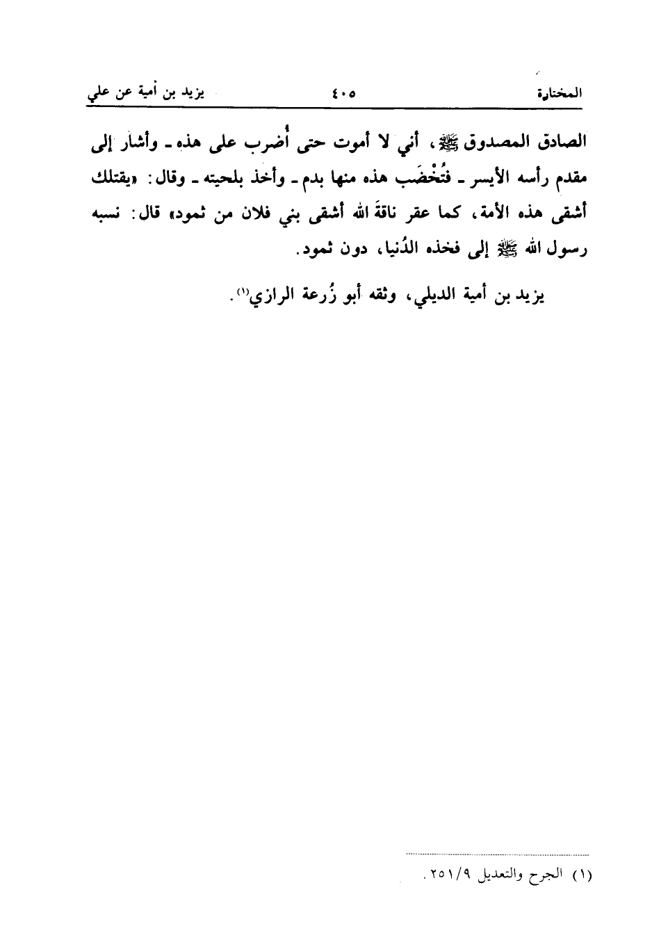 الصَّادِقُ الْمَصْدُوقُ صَلَّى اللَّه عَلَيْهِ وَسَلَّمَ أَنِّي لَا أَمُوتُ حَتَّى أُضْرَبَ عَلَى هَذِهِ وَأَشَارَ إِلَى مُقَدَّمِ رَأْسِهِ الأَيْسَرِ فَتُخْضَبُ هَذِهِ مِنْهَا بِدَمٍ وَأَخَذَ بِلِحْيَتِهِ وَقَالَ يَقْتُلُكَ أَشْقَى هَذِهِ الأُمَّةِ كَمَا عَقَرَ نَاقَةَ اللَّهِ أَشْقَى بَنِي فُلانٍ مِنْ ثَمُودَ قَالَ نَسَبَهُ رَسُولُ اللَّهِ صَلَّى اللَّه عَلَيْهِ وَسَلَّمَ إِلَى فَخْذِهِ الدُّنْيَا دُونَ ثَمُودَ