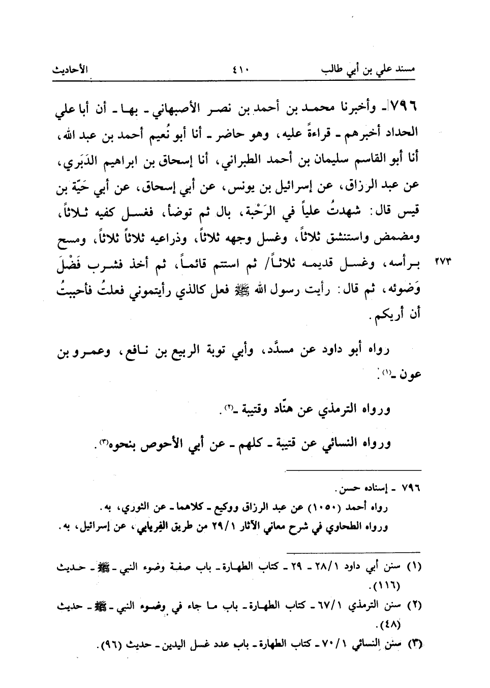 796 - وأَخْبَرَنَا مُحَمَّدُ بْنُ أَحْمَدَ بْنِ نَصْرٍ الأَصْبَهَانِيُّ بِهَا أَنَّ أَبَا عَلِيٍّ الْحَدَّادُ أَخْبَرَهُمْ قِرَاءَةً عَلَيْهِ وَهُوَ حَاضِرٌ أَنا أَبُو نُعَيْمٍ أَحْمَدُ بن عبد الله أَنا أَبُو الْقَاسِمِ سُلَيْمَانُ بْنُ أَحْمَدَ الطَّبَرَانِيُّ أَنا إِسْحَاق بن إِبْرَاهِيم الدبرِي عَن عبد الرَّزَّاق عَنْ إِسْرَائِيلَ بْنِ يُونُسَ عَنْ أَبِي إِسْحَاقَ عَنْ أَبِي حَيَّةَ بْنِ قَيْسٍ قَالَ شَهِدْتُ عَلِيًّا فِي الرَّحْبَةِ بَالَ ثُمَّ تَوَضَّأَ فَغَسَلَ كَفَّيْهِ ثَلاثًا وَمَضْمَضَ وَاسْتَنْشَقَ ثَلاثًا وَغَسَلَ وَجْهَهُ ثَلاثًا وَذِرَاعَيْهِ ثَلاثًا ثَلاثًا وَمَسَحَ بِرَأْسِهِ وَغَسَلَ قديمه ثَلاثًا ثُمَّ اسْتَتَمَّ قَائِمًا ثُمَّ أَخَذَ فَشَرِبَ فَضْلَ وَضُوئِهِ ثُمَّ قَالَ رَأَيْتُ رَسُولَ اللَّهِ صَلَّى اللَّه عَلَيْهِ وَسَلَّمَ فَعَلَ كَالَّذِي رَأَيْتُمُونِي فَعَلْتُ فَأَحْبَبْتُ أَنْ أُرِيَكُمْ