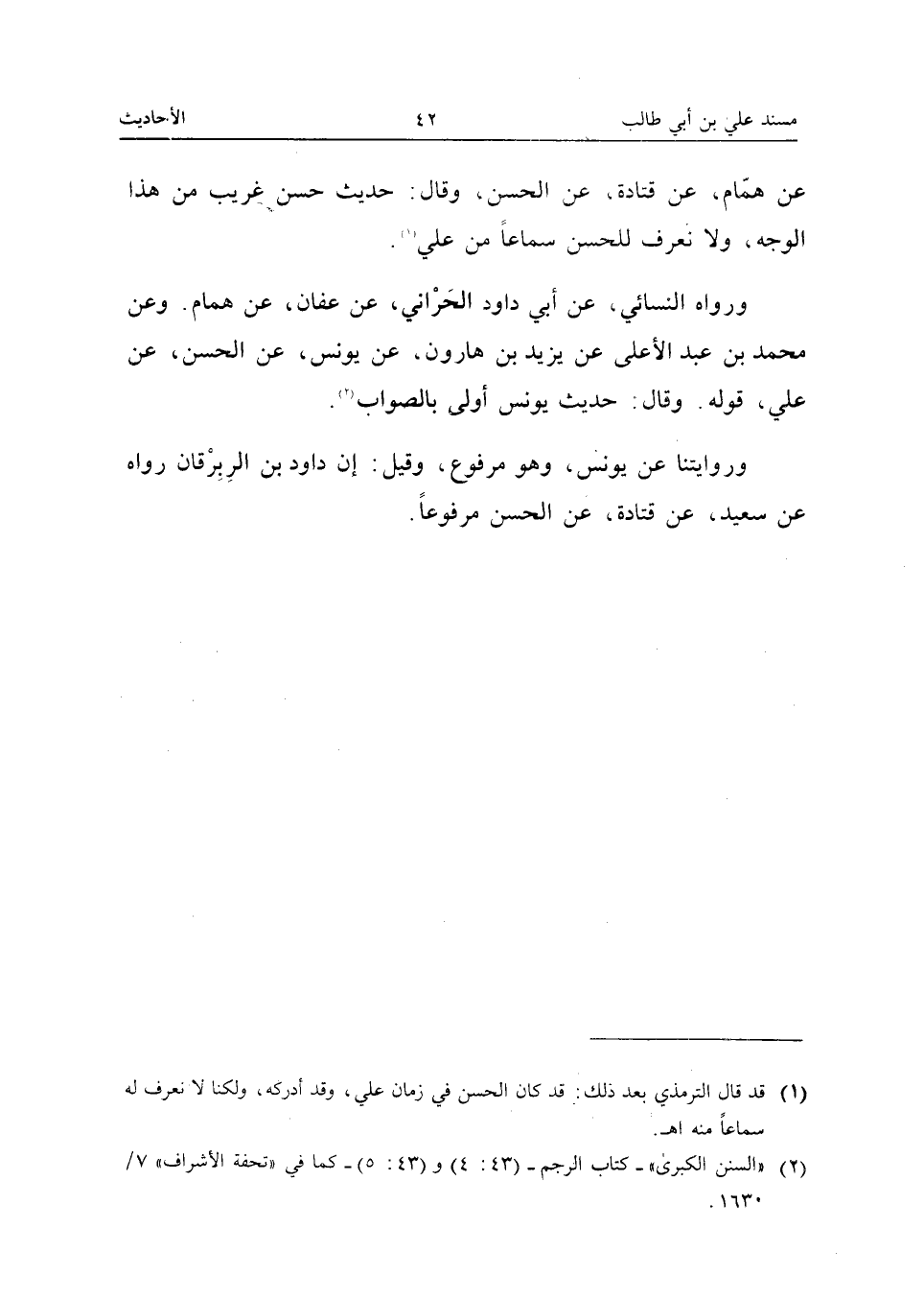 عَنْ هَمَّامٍ عَنْ قَتَادَةَ عَنِ الْحَسَنِ وَقَالَ حَدِيثٌ حَسَنٌ غَرِيبٌ مِنْ هَذَا الْوَجْهِ وَلَا نَعْرِفُ لِلْحَسَنِ سَمَاعًا مِنْ عَلِيٍّ وَرَوَاهُ النَّسَائِيُّ عَنْ أَبِي دَاوُدَ الْحَرَّانِيِّ عَنْ عَفَّانَ عَنْ همام وَعَن مُحَمَّد بن عبد الْأَعْلَى عَنْ يَزِيدَ بْنِ هَارُونَ عَنْ يُونُسَ عَنِ الْحَسَنِ عَنْ عَلِيٍّ قَوْلَهُ وَقَالَ حَدِيثُ يُونُسَ أَوْلَى بِالصَّوَابِ وَرِوَايَتُنَا عَنْ يُونُسَ وَهُوَ مَرْفُوعٌ وَقِيلَ إِنَّ دَاوُدَ بْنَ الزِّبْرِقَانِ رَوَاهُ عَنْ سعيد عَن قَتَادَة عَن الْحسن مَرْفُوعا (إِسْنَاده صَحِيح)