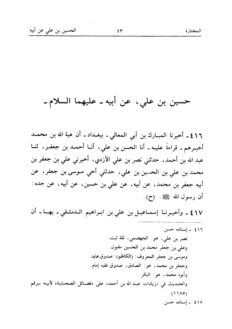 416 - أَخْبَرَنَا الْمُبَارَكُ بْنُ أَبِي الْمَعَالِي بِبَغْدَادَ أَنَّ هِبَةَ اللَّهِ بْنَ مُحَمَّدٍ أَخْبَرَهُمْ قِرَاءَةً عَلَيْهِ أَنا الْحَسَنُ بْنُ عَلِيٍّ أَنا أَحْمَدُ بْنُ جَعْفَر ثَنَا عبد الله بْنُ أَحْمَدَ حَدَّثَنِي نَصْرُ بْنُ عَلِيٍّ الأَزْدِيُّ أَخْبَرَنِي عَلِيُّ بْنُ جَعْفَرِ بْنِ مُحَمَّدِ بْنِ عَلِيِّ بْنِ الْحُسَيْنِ بْنِ عَلِيٍّ حَدَّثَنِي أَخِي مُوسَى بْنُ جَعْفَرٍ عَنْ أَبِيهِ جَعْفَرِ بْنِ مُحَمَّدٍ عَنْ أَبِيهِ عنْ عَلِيِّ بْنِ حُسَيْنٍ عَنْ أَبِيهِ عَنْ جَدِّهِ أَنَّ رَسُولَ اللَّهِ صلى الله عَلَيْهِ وَسلم (ح) (إِسْنَاده حسن)