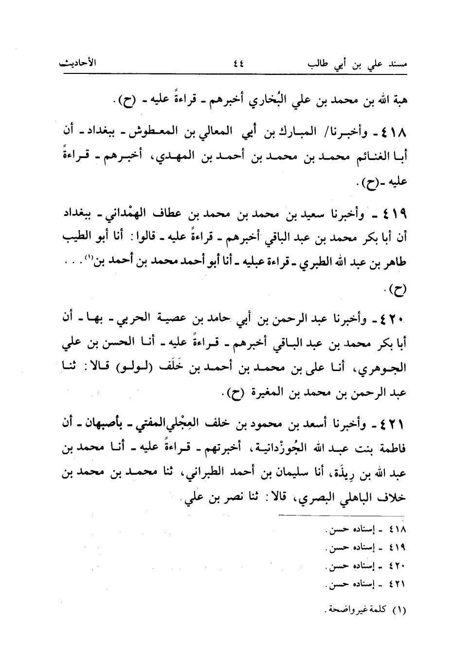 418 - وأَخْبَرَنَا الْمُبَارَكُ بْنُ أَبِي الْمَعَالِي بْنِ الْمَعْطُوشِ بِبَغْدَادَ أَنَّ أَبَا الْغَنَائِمِ مُحَمَّدَ بْنَ مُحَمَّدِ بْنِ أَحْمَدَ بْنِ الْمَهْدِيِّ أَخْبَرَهُمْ قِرَاءَةً عَلَيْهِ (ح) (إِسْنَاده حسن)