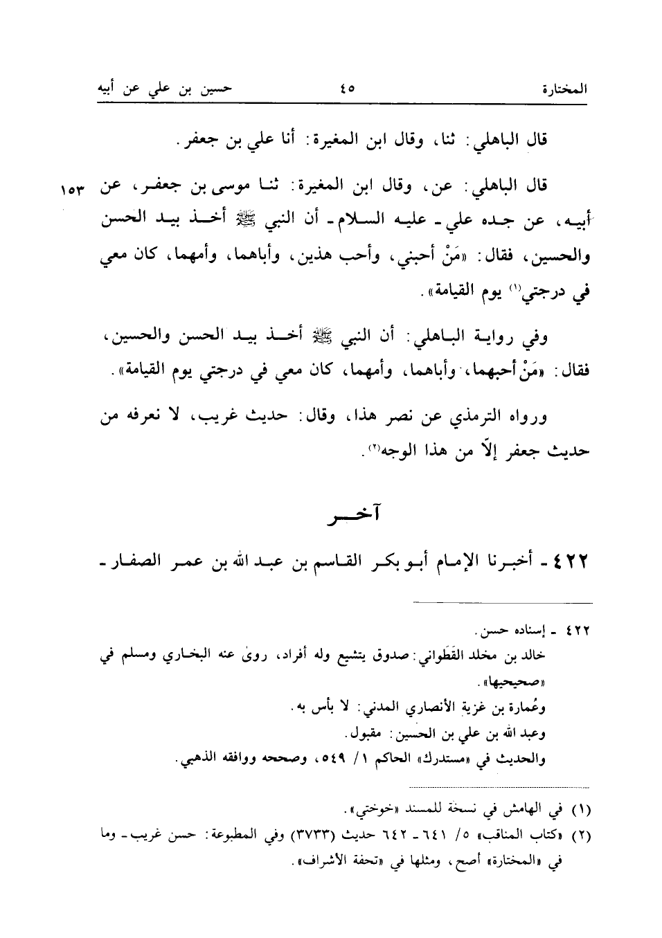 قَالَ الْبَاهِلِيُّ ثَنَا وَقَالَ ابْنُ الْمُغِيرَةِ أَنَا عَلِيُّ بْنُ جَعْفَرٍ قَالَ الْبَاهِلِيُّ عَنْ وَقَالَ ابْنُ الْمُغِيرَةِ ثَنَا مُوسَى بْنُ جَعْفَرٍ عَنْ أَبِيهِ عَنْ جَدِّهِ عَلِيٍّ عَلَيْهِ السَّلامُ أَنَّ النَّبِيَّ صَلَّى اللَّه عَلَيْهِ وَسَلَّمَ أَخَذَ بِيَدِ الْحَسَنِ وَالْحُسَيْنِ فَقَالَ مَنْ أَحَبَّنِي وَأَحَبَّ هَذَيْنِ وَأَبَاهُمَا وَأُمَّهُمَا كَانَ مَعِي فِي دَرَجَتِي يَوْمَ الْقِيَامَةِ وَفِي رِوَايَةِ الْبَاهِلِيِّ أَنَّ النَّبِيَّ صَلَّى اللَّه عَلَيْهِ وَسَلَّمَ أَخَذَ بِيَدِ الْحَسَنِ وَالْحُسَيْنِ فَقَالَ مَنْ أَحَبَّهُمَا وَأَبَاهُمَا وَأُمَّهُمَا كَانَ مَعِي فِي دَرَجَتِي يَوْمَ الْقِيَامَةِ وَرَوَاهُ التِّرْمِذِيُّ عَنْ نَصْرٍ هَذَا وَقَالَ حَدِيثٌ غَرِيبٌ لَا نَعْرِفُهُ مِنْ حَدِيثِ جَعْفَرٍ إِلَّا مِنْ هَذَا الْوَجْهِ (إِسْنَاده حسن)