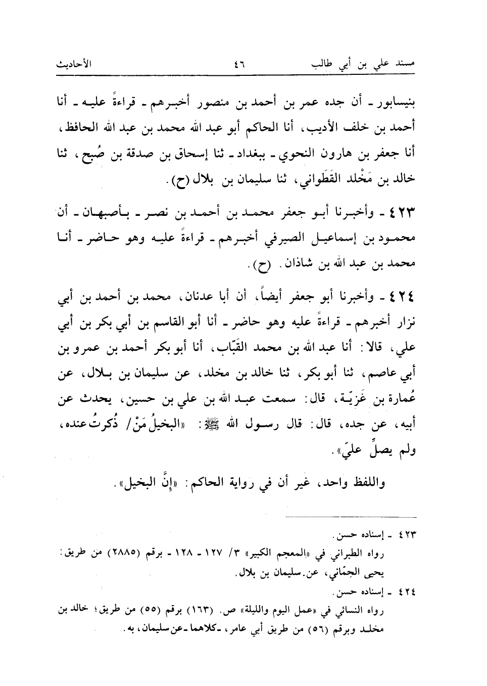 424 - وَأَخْبَرَنَا أَبُو جَعْفَرٍ أَيْضًا أَنَّ أَبَا عَدْنَانَ مُحَمَّدَ بْنَ أَحْمَدَ بْنِ أَبِي نِزَارٍ أَخْبَرَهُمْ قِرَاءَةً عَلَيْهِ وَهُوَ حَاضِرٌ أَنَا أَبُو الْقَاسِمِ بْنُ أَبِي بَكْرِ بْنِ أَبِي عَلِيٍّ قَالا أَنا عبد الله بْنُ مُحَمَّدٍ الْقَبَّابُ أَنا أَبُو بَكْرٍ أَحْمَدُ بْنُ عَمْرِو بْنِ أَبِي عَاصِمٍ ثَنَا أَبُو بَكْرٍ ثَنَا خَالِدُ بْنُ مَخْلَدٍ عَنْ سُلَيْمَانَ بْنِ بِلالٍ عَنْ عُمَارَةَ بْنِ غَزِيَّةَ قَالَ سَمِعت عبد الله بْنَ عَلِيِّ بْنِ حُسَيْنٍ يُحَدِّثُ عَنْ أَبِيهِ عَنْ جَدِّهِ قَالَ قَالَ رَسُولُ اللَّهِ صَلَّى اللَّه عَلَيْهِ وَسَلَّمَ الْبَخِيلُ مَنْ ذُكِرْتُ عِنْدَهُ وَلَمْ يُصَلِّ عَلَيَّ