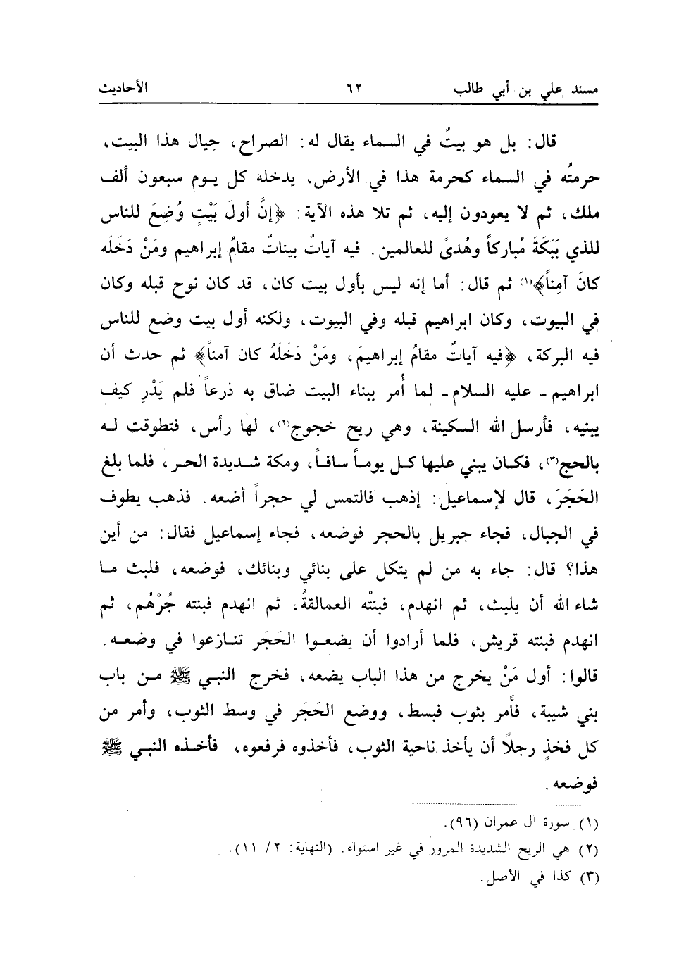قَالَ بَلْ هُوَ بَيْتٌ فِي السَّمَاءِ يُقَالُ لَهُ الصّرَاحُ حِيَالَ هَذَا الْبَيْتِ حُرْمَتُهُ فِي السَّمَاءِ كَحُرْمَةِ هَذَا فِي الأَرْضِ يَدْخُلُهُ كُلَّ يَوْمٍ سَبْعُونَ أَلْفَ مَلَكٍ ثُمَّ لَا يَعُودُونَ إِلَيْهِ ثُمَّ تَلا هَذِهِ الآيَةَ {إِنَّ أَوَّلَ بَيْتٍ وُضِعَ لِلنَّاسِ لَلَّذِي بِبَكَّةَ مُبَارَكًا وَهُدًى لِلْعَالَمِينَ فِيهِ آيَاتٌ بَيِّنَاتٌ مَقَامُ إِبْرَاهِيمَ وَمَنْ دخله كَانَ آمنا} ثُمَّ قَالَ أَمَا إِنَّهُ لَيْسَ بِأَوَّلِ بَيْتٍ كَانَ قَدْ كَانَ نُوحٌ قَبْلَهُ وَكَانَ فِي الْبُيُوتِ وَكَانَ إِبْرَاهِيمُ قَبْلَهُ وَفِي الْبُيُوتِ وَلَكِنَّهُ أَوَّلُ بَيْتٍ وُضِعَ لِلنَّاسِ فِيهِ الْبَرَكَةُ {فِيهِ آيَاتٌ بَيِّنَاتٌ مَقَامُ إِبْرَاهِيمَ وَمَنْ دَخَلَهُ كَانَ آمنا} ثُمَّ حَدَّثَ أَنَّ إِبْرَاهِيمَ عَلَيْهِ السَّلامُ لَمَّا أُمِرَ بِبِنَاءِ الْبَيْتِ ضَاقَ بِهِ ذَرْعًا فَلَمْ يَدْرِ كَيْفَ يَبْنِيهِ فَأَرْسَلَ اللَّهُ السَّكِينَةَ وَهِيَ رِيحٌ خَجُوجٍ لَهَا رَأْسٌ فَتَطَوَّقَتْ لَهُ بِالْحَجِّ فَكَانَ يَبْنِي عَلَيْهَا كل يَوْمًا سَافًا وَمَكَّةُ شَدِيدَةُ الْحَرِّ فَلَمَّا بَلَغَ الْحِجْرَ قَالَ لإِسْمَاعِيلَ اذْهَبْ فَالْتَمِسْ لِي حَجَراً أَضَعُهُ فَذَهَبَ يَطُوفُ فِي الْجِبَالِ فَجَاءَ جِبْرِيلُ بِالْحَجَرِ فَوَضَعَهُ فَجَاءَ إِسْمَاعِيلُ فَقَالَ مِنْ أَيْنَ هَذَا قَالَ جَاءَ بِهِ مَنْ لَمْ يَتَّكِلْ عَلَى بِنَائِي وَبِنَائِكَ فَوَضَعَهُ فَلَبِثَ مَا شَاءَ اللَّهُ أَنْ يَلْبُثَ ثُمَّ انْهَدَمَ فَبَنَتْهُ الْعَمَالِقَةُ ثُمَّ انْهَدَمَ فَبَنَتْهُ جُرْهُمٌ ثُمَّ انْهَدَمَ فَبَنَتْهُ قُرَيْشٌ فَلَمَّا أَرَادُوا أَنْ يَضَعُوا الْحَجَرَ تَنَازَعُوا فِي وَضْعِهِ قَالُوا أَوَّلُ مَنْ يَخْرُجُ مِنْ هَذَا الْبَابِ يَضَعُهُ فَخَرَجَ النَّبِيُّ صَلَّى اللَّه عَلَيْهِ وَسَلَّمَ مِنْ بَابِ بَنِي شَيْبَةَ فَأَمَرَ بِثَوْبٍ فَبُسِطَ وَوُضِعَ الْحَجَرُ فِي وَسَطِ الثَّوْبِ وَأَمَرَ مِنْ كُلِّ فَخْذٍ رَجُلا أَنْ يَأْخُذَ نَاحِيَةَ الثَّوْبِ فَأَخَذُوهُ فَرَفَعُوهُ فَأَخَذَهُ النَّبِيُّ صَلَّى اللَّه عَلَيْهِ وَسَلَّمَ فَوَضَعَهُ