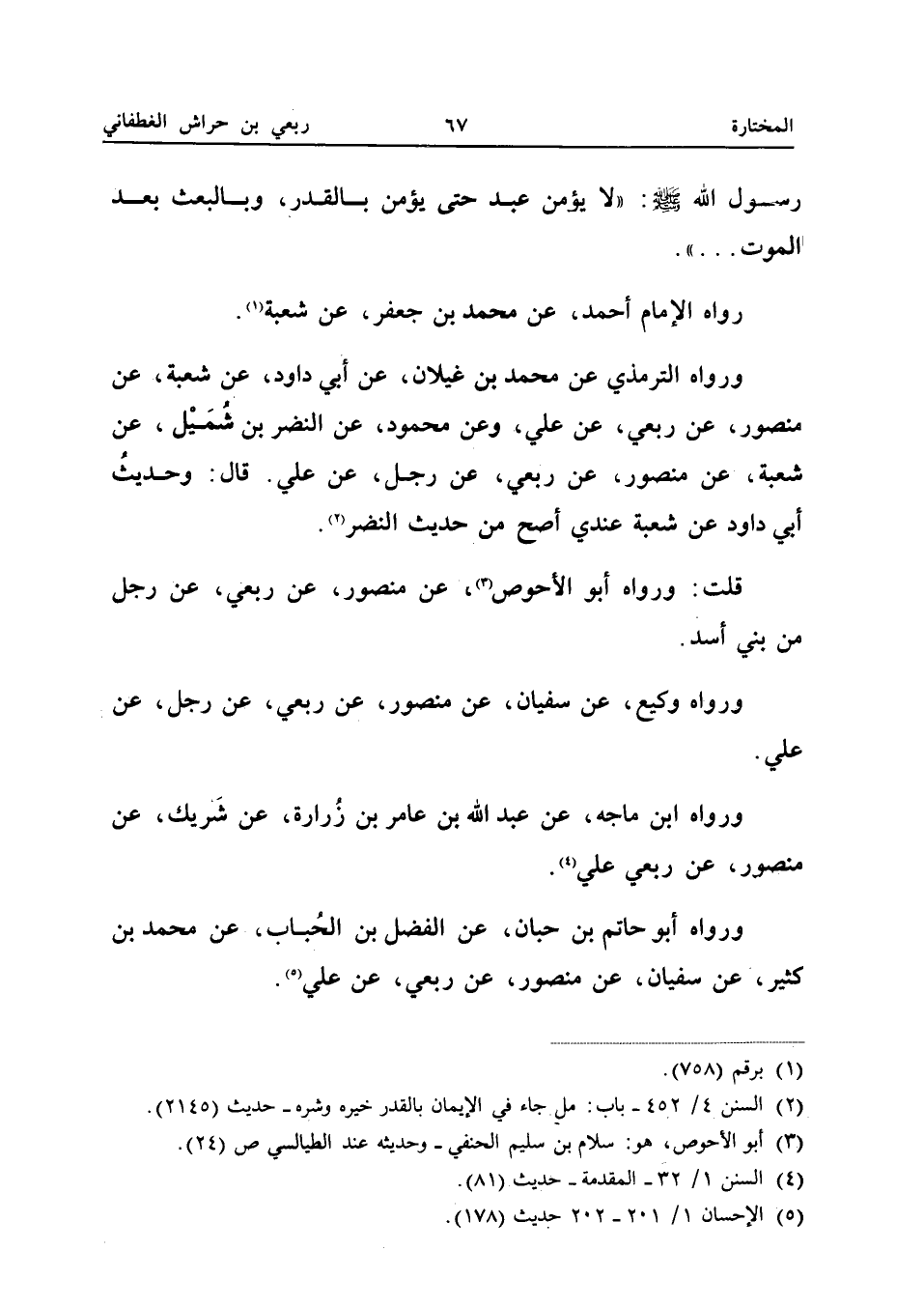 رَوَاهُ الإِمَامُ أَحْمَدُ عَنْ مُحَمَّدِ بْنِ جَعْفَرٍ عَنْ شُعْبَةَ وَرَوَاهُ التِّرْمِذِيُّ عَنْ مُحَمَّدِ بْنِ غَيْلانَ عَنْ أَبِي دَاوُدَ عَنْ شُعْبَةَ عَنْ مَنْصُورٍ عَنْ رِبْعِيٍّ عَنْ عَلِيٍّ وَعَنْ مَحْمُودٍ عَنِ النَّضْرِ بْنِ شُمَيْلٍ عَنْ شُعْبَةَ عَنْ مَنْصُورٍ عَنْ رِبْعِيٍّ عَنْ رَجُل عَنْ عَلِيٍّ قَالَ وَحَدِيثُ أَبِي دَاوُدَ عَنْ شُعْبَةَ عِنْدِي أَصَحُّ مِنْ حَدِيثِ النَّضْرِ قُلْتُ وَرَوَاهُ أَبُو الأَحْوَصِ عَنْ مَنْصُورٍ عَنْ رِبْعِيٍّ عَنْ رَجُلٍ مِنْ بَنِي أَسَدٍ وَرَوَاهُ وَكِيعٌ عَنْ سُفْيَانَ عَنْ مَنْصُورٍ عَنْ رِبْعِيٍّ عَنْ رَجُلٍ عَن عَليّ وَرَوَاهُ ابْن مَاجَه عَن عبد الله بْنِ عَامِرِ بْنِ زُرَارَةَ عَنْ شَرِيكٍ عَنْ مَنْصُور عَن ربعي عَلِيٍّ وَرَوَاهُ أَبُو حَاتِمِ بْنُ حِبَّانَ عَنِ الْفَضْلِ بْنِ الْحُبَابِ عَنْ مُحَمَّدِ بْنِ كَثِيرٍ عَنْ سُفْيَانَ عَنْ مَنْصُورٍ عَنْ رِبْعِيٍّ عَنْ عَليّ