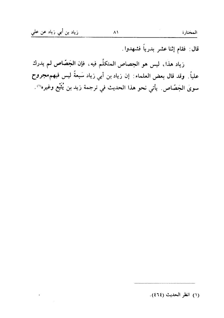 زِيَادٌ هَذَا لَيْسَ هُوَ الْجَصَّاصُ الْمُتْكَلَّمُ فِيهِ فَإِنَّ الْجَصَّاصَ لَمْ يُدْرِكْ عَلِيًّا وَقَدْ قَالَ بَعْضُ الْعُلَمَاءِ إِنَّ زِيَادَ بْنَ أَبِي زِيَادٍ سَبْعَةٌ لَيْسَ فِيهِمْ مَجْرُوحٌ سِوَى الْجَصَّاصِ يَأْتِي نَحْوُ هَذِه الْحَدِيثِ فِي تَرْجَمَةِ زَيْدِ بْنِ يُثَيْعٍ وَغَيْرِهِ (إِسْنَاده لَا بَأْس بِهِ)