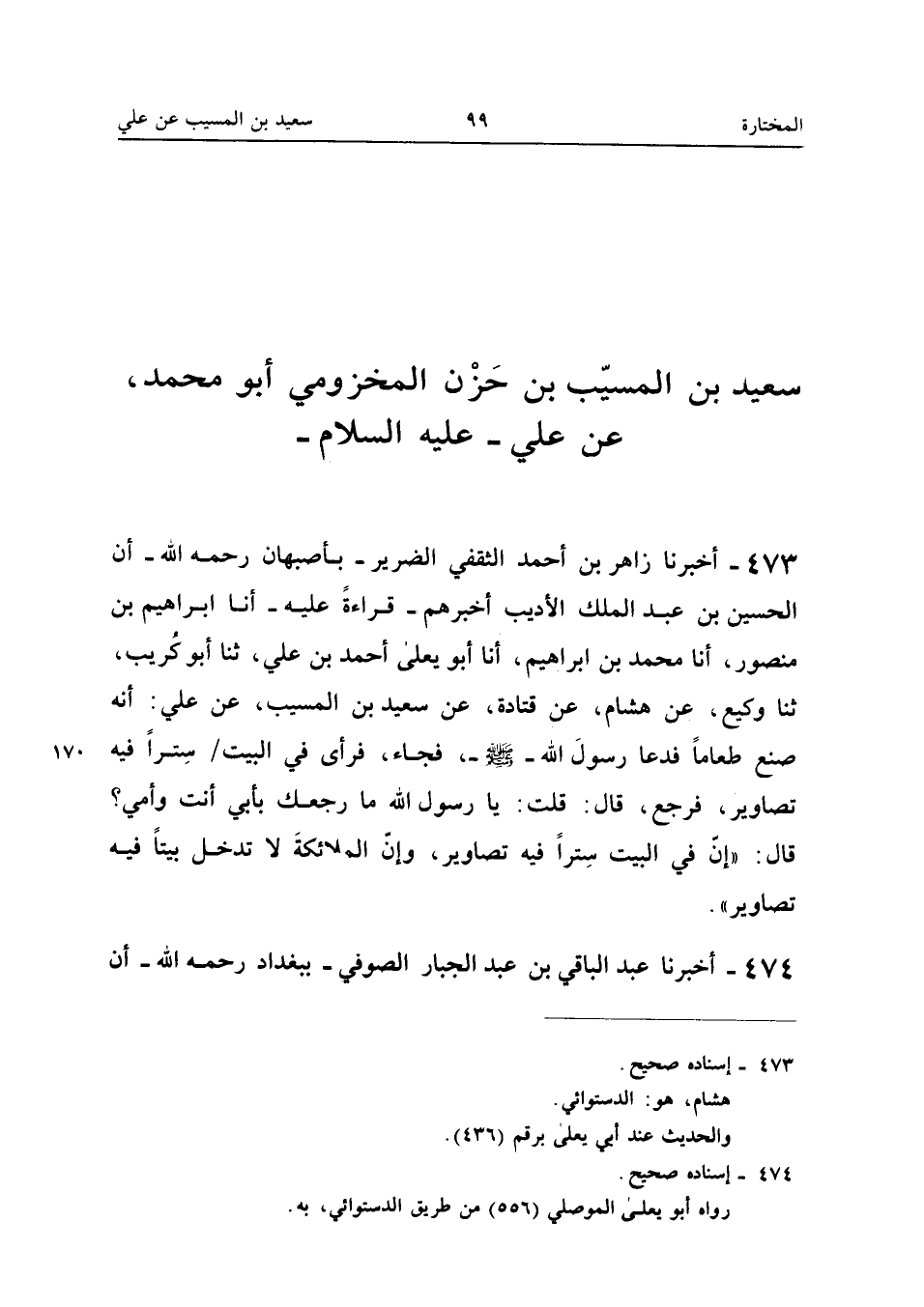 473 - أَخْبَرَنَا زَاهِرُ بْنُ أَحْمَدَ الثَّقَفِيُّ الضَّرِيرُ بِأَصْبَهَانَ رَحِمَهُ اللَّهُ أَن الْحُسَيْن بن عبد الْملك الأَدِيبَ أَخْبَرَهُمْ قِرَاءَةً عَلَيْهِ أَنا إِبْرَاهِيمُ بْنُ مَنْصُورٍ أَنا مُحَمَّدُ بْنُ إِبْرَاهِيمَ أَنا أَبُو يَعْلَى أَحْمَدُ بْنُ عَلِيٍّ ثَنَا أَبُو كُرَيْبٍ ثَنَا وَكِيعٌ عَنْ هِشَامٍ عَنْ قَتَادَةَ عَنْ سَعِيدِ بْنِ الْمُسَيِّبِ عَنْ عَلِيٍّ أَنَّهُ صَنَعَ طَعَامًا فَدَعَا رَسُولُ اللَّهِ صَلَّى اللَّه عَلَيْهِ وَسَلَّمَ فَجَاءَ فَرَأَى فِي الْبَيْتِ سِتْرًا فِيهِ تصاوير فَرجع قَالَ قلت يَا روسل اللَّهِ مَا رَجَّعَكَ بِأَبِي أَنْتَ وَأُمِّي قَالَ إِنَّ فِي الْبَيْتِ سِتْرًا فِيهِ تَصَاوِيرُ وَإِنَّ الْمَلَائِكَة لَا تدخل بَيْتا فِيهِ تصاوير (إِسْنَاده صَحِيح)