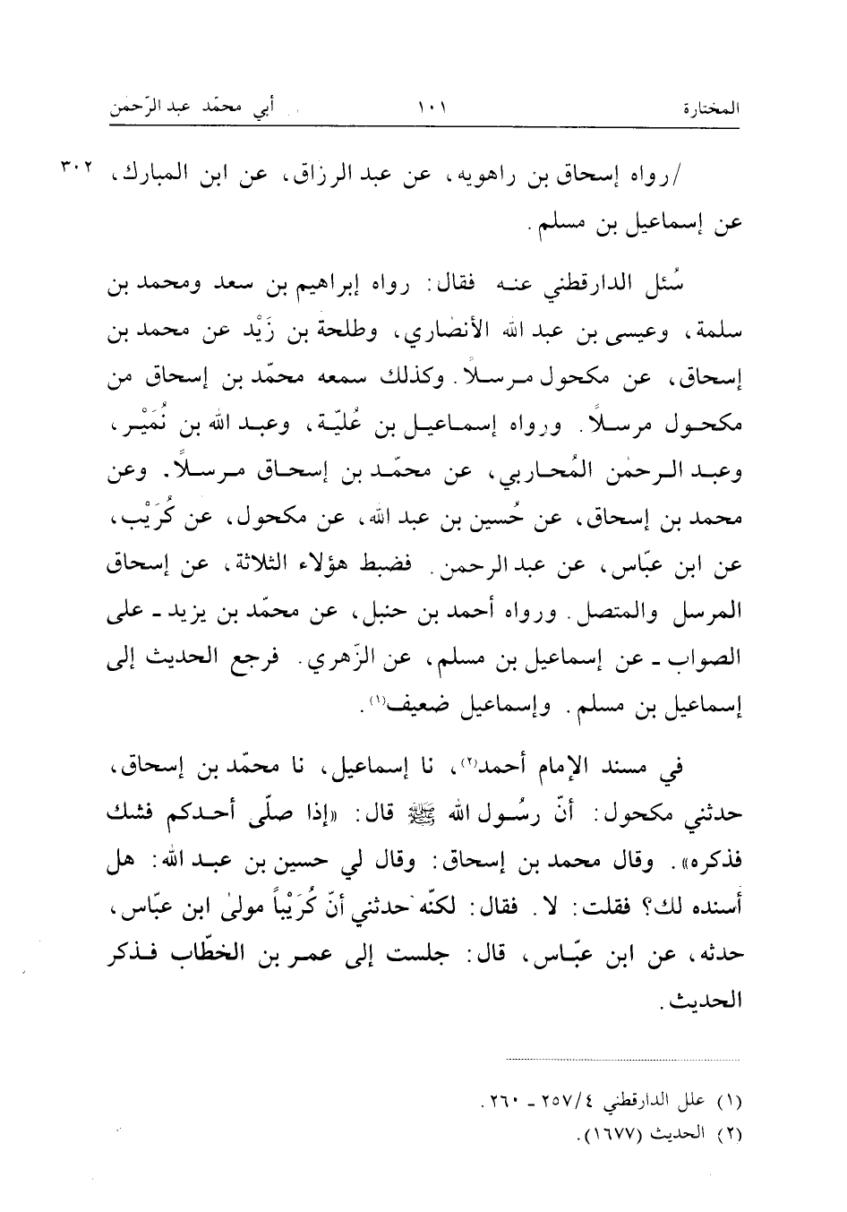 رَوَاهُ إِسْحَاق بن رَاهَوَيْه عَن عبد الرَّزَّاق عَنِ ابْنِ الْمُبَارَكِ عَنْ إِسْمَاعِيلَ بْنِ مُسْلِمٍ سُئِلَ الدَّارَقُطْنِيُّ عَنْهُ فَقَالَ رَوَاهُ إِبْرَاهِيمُ بْنُ سعد وَمُحَمّد بن سَلمَة وَعِيسَى بن عبد الله الأَنْصَارِيُّ وَطَلْحَةُ بْنُ زَيْدٍ عَنْ مُحَمَّدِ بْنِ إِسْحَاقَ عَنْ مَكْحُولٍ مُرْسَلا وَكَذَلِكَ سَمِعَهُ مُحَمَّدُ بْنُ إِسْحَاقَ مِنْ مَكْحُولٍ مُرْسَلا وَرَوَاهُ إِسْمَاعِيلُ بن علية وَعبد الله بن نمير وَعبد الرَّحْمَن الْمُحَارِبِيُّ عَنْ مُحَمَّدِ بْنِ إِسْحَاقَ مُرْسَلا وَعَنْ مُحَمَّد بن إِسْحَاق عَن حُسَيْن بن عبد الله عَنْ مَكْحُولٍ عَنْ كُرَيْبٍ عَنِ ابْنِ عَبَّاسٍ عَن عبد الرَّحْمَن فَضَبَطَ هَؤُلاءِ الثَّلاثَةُ عَنْ إِسْحَاقَ الْمُرْسَلَ وَالْمُتَّصِلَ وَرَوَاهُ أَحْمَدُ بْنُ حَنْبَلٍ عَنْ مُحَمَّدِ بْنِ يَزِيدَ عَلَى الصَّوَابِ عَنْ إِسْمَاعِيلَ بْنِ مُسْلِمٍ عَنِ الزُّهْرِيِّ فَرَجَعَ الْحَدِيثُ إِلَى إِسْمَاعِيلَ بْنِ مُسْلِمٍ وَإِسْمَاعِيلُ ضَعِيفٌ فِي مُسْنَدِ الإِمَامِ أَحْمَدَ نَا إِسْمَاعِيلُ نَا مُحَمَّدُ بْنُ إِسْحَاقَ حَدَّثَنِي مَكْحُولٌ أَنَّ رَسُولَ اللَّهِ صَلَّى اللَّهُ عَلَيْهِ وَسَلَّمَ قَالَ إِذَا صَلَّى أَحَدُكُمْ فَشَكَّ فَذَكَرَهُ وَقَالَ مُحَمَّدُ بْنُ إِسْحَاقَ وَقَالَ لِي حُسَيْنُ بن عبد الله هَلْ أَسْنَدَهُ لَكَ فَقُلْتُ لَا فَقَالَ لَكِنَّهُ حَدَّثَنِي أَنَّ كُرَيْبًا مَوْلَى ابْنِ عَبَّاسٍ حَدَّثَهُ عَنِ ابْنِ عَبَّاسٍ قَالَ جَلَسْتُ إِلَى عُمَرَ بْنِ الْخَطَّابِ فَذَكَرَ الْحَدِيثَ