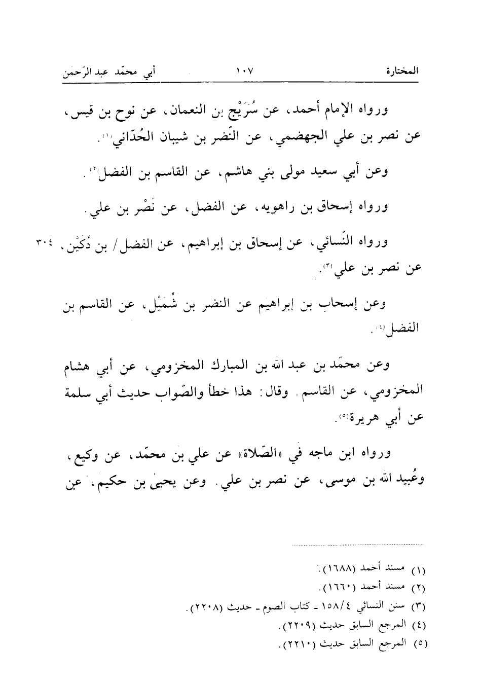 وَرَوَاهُ الإِمَامُ أَحْمَدُ عَنْ سُرَيْجِ بْنِ النُّعْمَانِ عَنْ نُوحِ بْنِ قَيْسٍ عَنْ نَصْرِ بْنِ عَلِيٍّ الْجَهْضَمِيِّ عَنِ النَّضْرِ بْنِ شَيْبَانَ الْحُدَّانِيِّ وَعَنْ أَبِي سَعِيدٍ مَوْلَى بَنِي هَاشِمٍ عَنِ الْقَاسِمِ بْنِ الْفَضْلِ وَرَوَاهُ إِسْحَاقُ بْنُ رَاهُوَيْهِ عَنِ الْفَضْلِ عَنْ نَصْرِ بْنِ عَلِيٍّ وَرَوَاهُ النَّسَائِيُّ عَنْ إِسْحَاقَ بْنِ إِبْرَاهِيمَ عَنِ الْفَضْلِ بْنِ دُكَيْنٍ عَنْ نَصْرِ بْنِ عَلِيٍّ وَعَنْ إسحاب بْنِ إِبْرَاهِيمَ عَنِ النَّضْرِ بْنِ شُمَيْلٍ عَنِ الْقَاسِم بن الْفضل وَعَن مُحَمَّد بن عبد الله بْنِ الْمُبَارَكِ الْمَخْزُومِيِّ عَنْ أَبِي هِشَامٍ الْمَخْزُومِيِّ عَنِ الْقَاسِمِ وَقَالَ هَذَا خَطَأٌ وَالصَّوَابُ حَدِيثُ أَبِي سَلَمَةَ عَنْ أَبِي هُرَيْرَةَ وَرَوَاهُ ابْنُ مَاجَهْ فِي الصَّلاةِ عَنْ عَلِيِّ بْنِ مُحَمَّدٍ عَن وَكِيع وعبيد الله بْنِ مُوسَى عَنْ نَصْرِ بْنِ عَلِيٍّ وَعَنْ يَحْيَى بْنِ حَكِيمٍ عَنْ