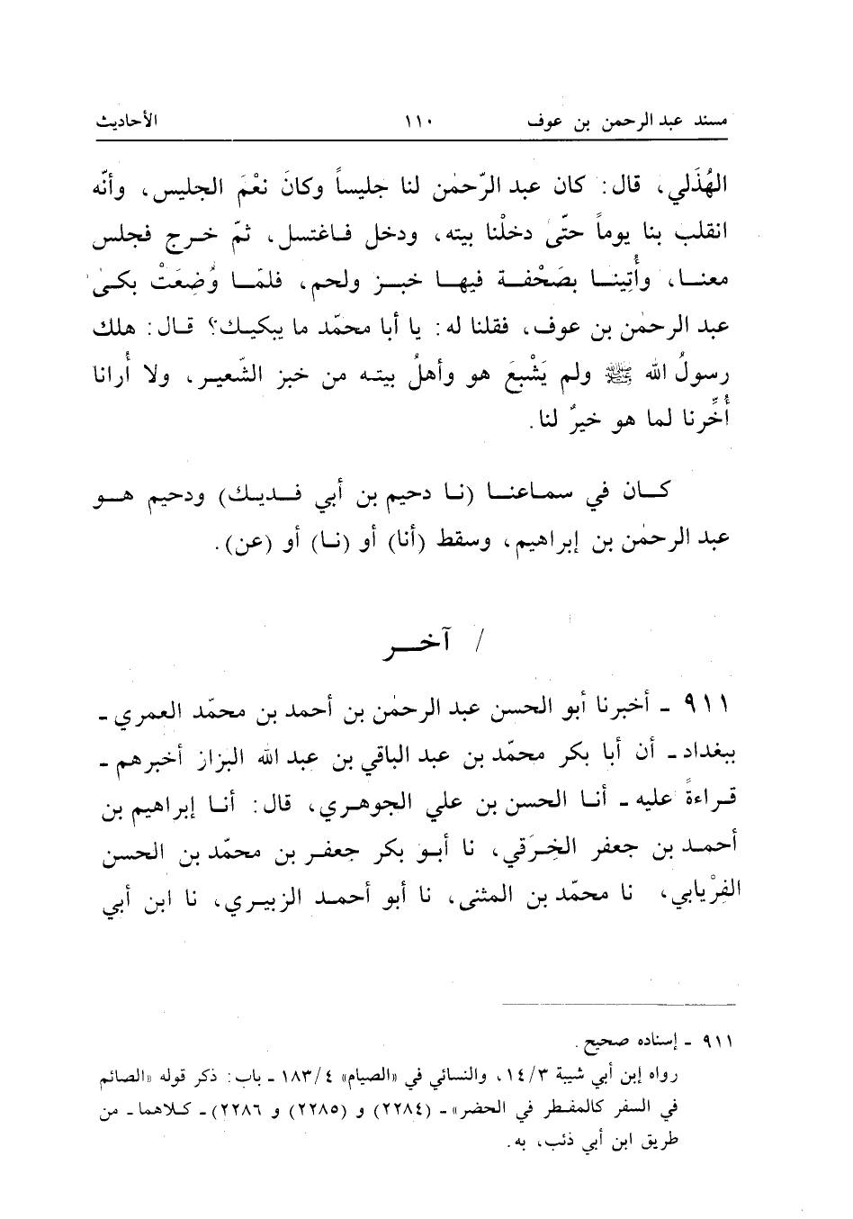 الْهُذلِيّ قَالَ كَانَ عبد الرَّحْمَن لَنَا جَلِيسًا وَكَانَ نِعْمَ الْجَلِيسُ وَإِنَّهُ انْقَلَبَ بِنَا يَوْمًا حَتَّى دَخَلْنَا بَيْتَهُ وَدَخَلَ فَاغْتَسَلَ ثُمَّ خَرَجَ فَجَلَسَ مَعَنَا وَأُتِينَا بِصَحْفَةٍ فِيهَا خبز وَلحم فَلَمَّا وضعت بَكَى عبد الرَّحْمَن بْنُ عَوْفٍ فَقُلْنَا لَهُ يَا أَبَا مُحَمَّدٍ مَا يُبْكِيكَ قَالَ هَلَكَ رَسُولُ اللَّهِ صَلَّى اللَّهُ عَلَيْهِ وَسَلَّمَ وَلَمْ يَشْبَعْ هُوَ وَأَهْلُ بَيْتِهِ مِنْ خُبْزِ الشَّعِيرِ وَلا أَرَانَا أُخِّرْنَا لِمَا هُوَ خَيْرٌ لَنَا كَانَ فِي سَمَاعِنَا (نَا دُحَيْمُ بْنُ أَبِي فُدَيْكٍ) وَدُحَيْمٌ هُوَ عبد الرَّحْمَن بْنُ إِبْرَاهِيمَ وَسَقَطَ (أَنا) أَوْ (نَا) أَوْ (عَن) (إِسْنَاده حسن)