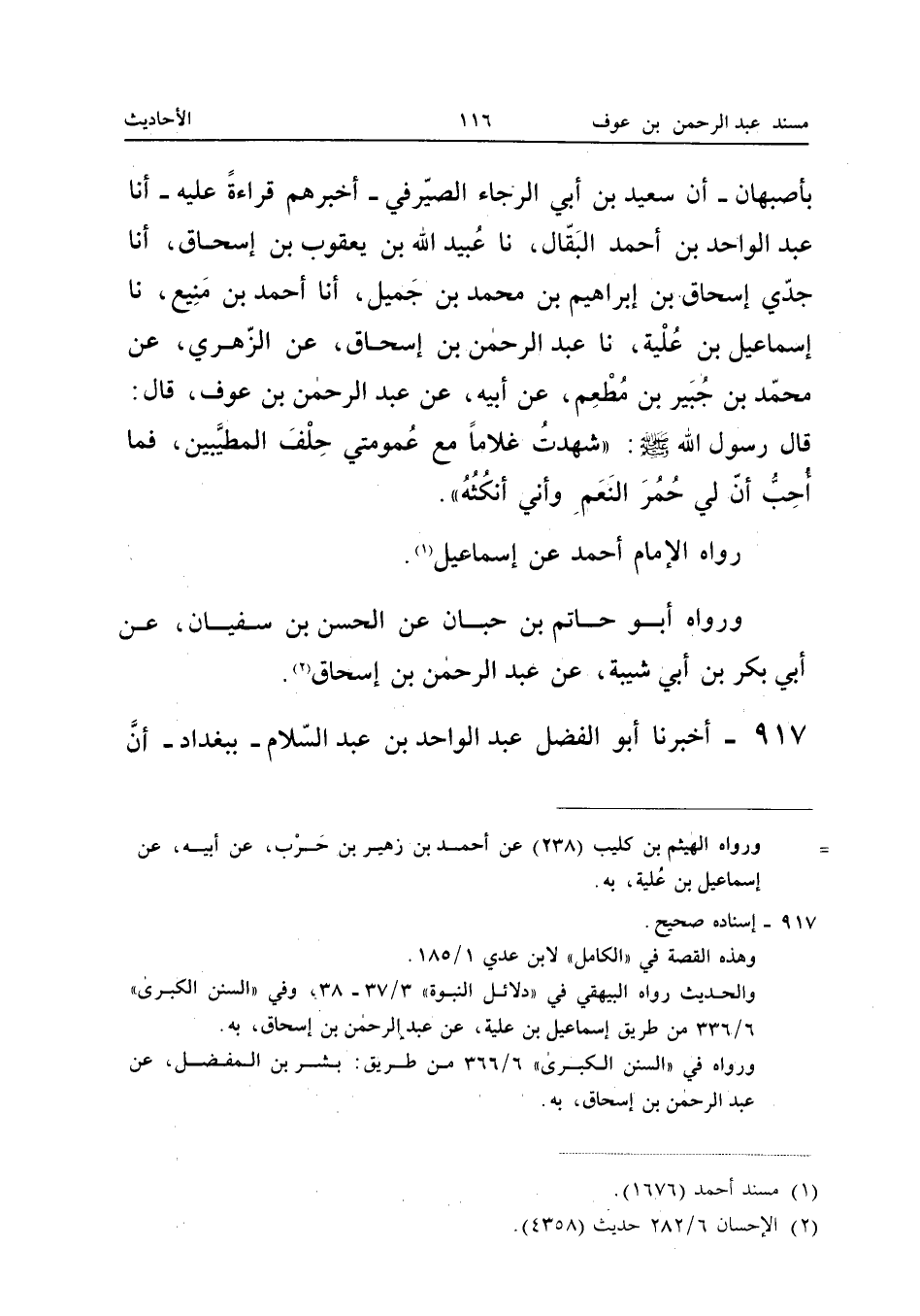بِأَصْبَهَانَ أَنَّ سَعِيدَ بْنَ أَبِي الرَّجَاءِ الصَّيْرَفِيَّ أخْبرهُم قِرَاءَة عَلَيْهِ أَنا عبد الْوَاحِد بن أَحْمد الْبَقَّال نَا عبيد الله بْنُ يَعْقُوبَ بْنِ إِسْحَاقَ أَنا جَدِّي إِسْحَاقُ بْنُ إِبْرَاهِيمَ بْنِ مُحَمَّدِ بْنِ جَمِيلٍ أَنا أَحْمد بن منيع نَا إِسْمَاعِيل بن علية نَا عبد الرَّحْمَن بْنِ إِسْحَاقَ عَنِ الزُّهْرِيِّ عَنْ مُحَمَّدِ بْنِ جُبَير بن مطعم عَن أَبِيه عَن عبد الرَّحْمَن بْنِ عَوْفٍ قَالَ قَالَ رَسُولُ اللَّهِ صَلَّى اللَّهُ عَلَيْهِ وَسَلَّمَ شَهِدْتُ غُلامًا مَعَ عُمُومَتِي حِلْفَ الْمُطَيَّبِينَ فَمَا أُحِبُّ أَنَّ لِي حُمُرَ النَّعَمِ وَأَنِّي أَنْكُثُهُ رَوَاهُ الإِمَامُ أَحْمَدُ عَنْ إِسْمَاعِيلَ وَرَوَاهُ أَبُو حَاتِمِ بْنُ حِبَّانَ عَنْ الْحَسَنِ بْنِ سُفْيَانَ عَنْ أَبِي بَكْرِ بْنِ أبي شيبَة عَن عبد الرَّحْمَن بن إِسْحَاق (إِسْنَاده صَحِيح)