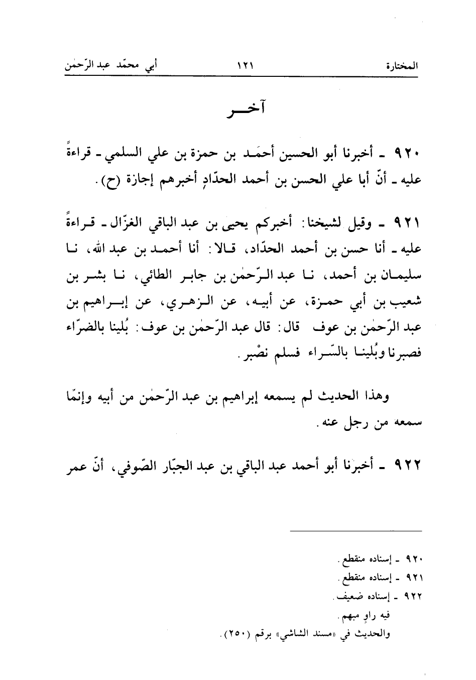 921 - وَقيل لشَيْخِنَا أخْبركُم يحيى بن عبد الْبَاقِي الْغَزَّالُ قِرَاءَةً عَلَيْهِ أَنا حَسَنُ بْنُ أَحْمَدَ الْحداد قَالَا أَنا أَحْمد بن عبد الله نَا سُلَيْمَان بن أَحْمد نَا عبد الرَّحْمَن بْنُ جَابِرٍ الطَّائِيُّ نَا بِشْرُ بْنُ شُعَيْبِ بْنِ أَبِي حَمْزَةَ عَنْ أَبِيهِ عَنِ الزُّهْرِيِّ عَن إِبْرَاهِيم بن عبد الرَّحْمَن بن عَوْف قَالَ قَالَ عبد الرَّحْمَن بْنُ عَوْفٍ بُلِينَا بِالضَّرَّاءِ فَصَبَرْنَا وَبُلِينَا بِالسَّرَّاءِ فَلَمْ نَصْبِرْ وَهَذَا الْحَدِيثُ لَمْ يَسْمَعْهُ إِبْرَاهِيمُ بن عبد الرَّحْمَن مِنْ أَبِيهِ وَإِنَّمَا سَمِعَهُ مِنْ رَجُلٍ عَنْهُ (إِسْنَاده مُنْقَطع)