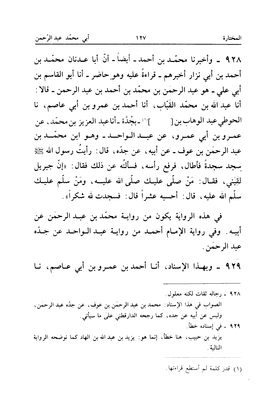 928 - وَأَخْبَرَنَا مُحَمَّدُ بْنُ أَحْمَدَ أَيْضًا أَنَّ أَبَا عَدْنَانَ مُحَمَّدَ بْنَ أَحْمَدَ بْنِ أَبِي نِزَارٍ أَخْبَرَهُمْ قِرَاءَةً عَلَيْهِ وَهُوَ حَاضِرٌ أَنا أَبُو الْقَاسِم بن أبي عَليّ هُوَ عبد الرَّحْمَن بن مُحَمَّد بن أَحْمد بن عبد الرَّحْمَن قَالَا أَنا عبد الله بْنُ مُحَمَّدٍ الْقَبَّابُ أَنا أَحْمَدُ بْنُ عَمْرِو بن أبي عَاصِم نَا الحوطي عبد الْوَهَّاب بن بجدة أَنا عبد الْعَزِيز بْنُ مُحَمَّدٍ عَنْ عَمْرِو بْنِ أَبِي عَمْرٍو عَن عبد الْوَاحِد وهوابن مُحَمَّد بن عبد الرَّحْمَن بْنِ عَوْفٍ عَنْ أَبِيهِ عَنْ جَدِّهِ قَالَ رَأَيْتُ رَسُولَ اللَّهِ صَلَّى اللَّهُ عَلَيْهِ وَسَلَّمَ سَجَدَ سَجْدَةً فَأَطَالَ فَرَفَعَ رَأْسَهُ فَسَأَلْتُهُ عَنْ ذَلِكَ فَقَالَ إِنَّ جِبْرِيلَ لَقِيَنِي فَقَالَ مَنْ صَلَّى عَلَيْكَ صَلَّى اللَّهُ عَلَيْهِ وَمَنْ سَلَّمَ عَلَيْكَ سَلَّمَ اللَّهُ عَلَيْهِ قَالَ أَحْسَبُهُ عَشْرًا قَالَ فَسَجَدْتُ لِلَّهِ شُكْرًا فِي هَذِهِ الرِّوَايَةِ يكون من رِوَايَة مُحَمَّد بن عبد الرَّحْمَن عَنْ أَبِيهِ وَفِي رِوَايَةِ الإِمَامِ أَحْمَدَ مِنْ رِوَايَة عبد الْوَاحِد عَن جده عبد الرَّحْمَن (رِجَاله ثِقَات لكنه مَعْلُول)