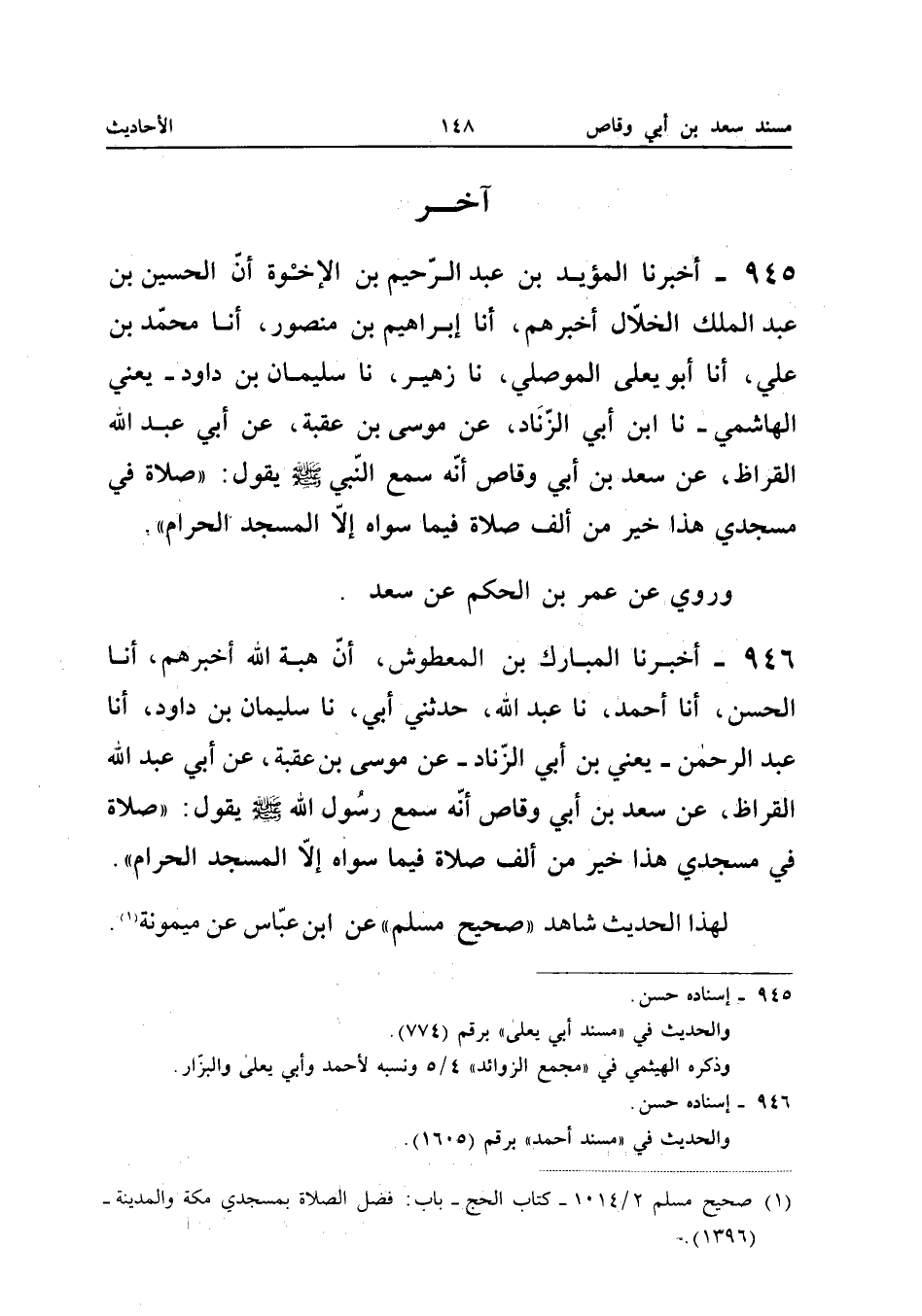 945 - أخبرنَا الْمُؤَيد بن عبد الرَّحِيم بن الْإِخْوَة أَن الْحُسَيْن بن عبد الْملك الْخَلالَ أَخْبَرَهُمْ أَنا إِبْرَاهِيمُ بْنُ مَنْصُورٍ أَنا مُحَمَّدُ بْنُ عَلِيٍّ أَنا أَبُو يَعْلَى الْمَوْصِلِيُّ نَا زُهَيْرٌ نَا سُلَيْمَانُ بْنُ دَاوُدَ يَعْنِي الْهَاشِمِيَّ نَا ابْنُ أَبِي الزِّنَادِ عَنْ مُوسَى بن عقبَة عَن أبي عبد الله الْقَرَّاظِ عَنْ سَعْدِ بْنِ أَبِي وَقَّاصٍ أَنَّهُ سَمِعَ النَّبِيَّ صَلَّى اللَّه عَلَيْهِ وَسَلَّمَ يَقُولُ صَلاةٌ فِي مَسْجِدِي هَذَا خَيْرٌ مِنْ أَلْفِ صَلاةٍ فِيمَا سِوَاهُ إِلا الْمَسْجِدَ الْحَرَامَ وَرُوِيَ عَن عمر بن الحكم عَن سعد (إِسْنَاده حسن)
