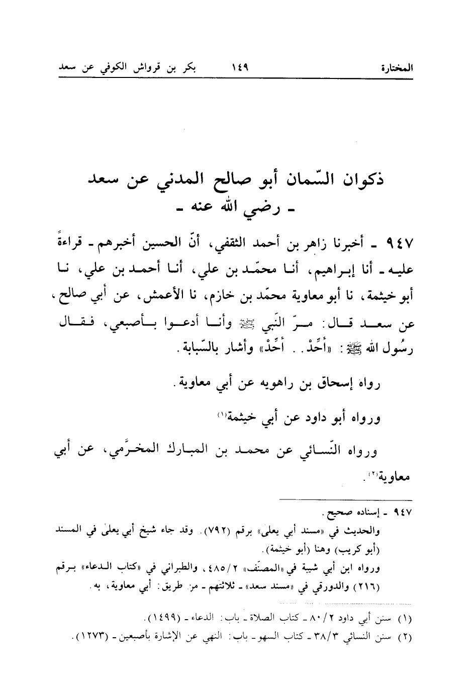 947 - أَخْبَرَنَا زَاهِرُ بْنُ أَحْمَدَ الثَّقَفِيُّ أَنَّ الْحُسَيْنَ أَخْبَرَهُمْ قِرَاءَةً عَلَيْهِ أَنا إِبْرَاهِيمُ أَنا مُحَمَّدُ بْنُ عَلِيٍّ أَنا أَحْمَدُ بْنُ عَلِيٍّ نَا أَبُو خَيْثَمَةَ نَا أَبُو مُعَاوِيَةَ مُحَمَّدُ بْنُ خَازِمٍ نَا الأَعْمَشُ عَنْ أَبِي صَالِحٍ عَنْ سَعْدٍ قَالَ مَرَّ النَّبِيُّ صَلَّى اللَّهُ عَلَيْهِ وَسَلَّمَ وَأَنَا أَدْعُو بِأُصْبُعِي فَقَالَ رَسُولُ اللَّهِ صَلَّى اللَّهُ عَلَيْهِ وَسَلَّمَ أَحَدٌ أَحَدٌ وَأَشَارَ بِالسَّبَّابَةِ رَوَاهُ إِسْحَاقُ بْنُ رَاهُوَيْهِ عَنْ أَبِي مُعَاوِيَةَ وَرَوَاهُ أَبُو دَاوُدَ عَنْ أَبِي خَيْثَمَةَ وَرَوَاهُ النَّسَائِيُّ عَنْ مُحَمَّدِ بْنِ الْمُبَارَكِ الْمُخَرِّمِيِّ عَنْ أَبِي مُعَاوِيَةَ