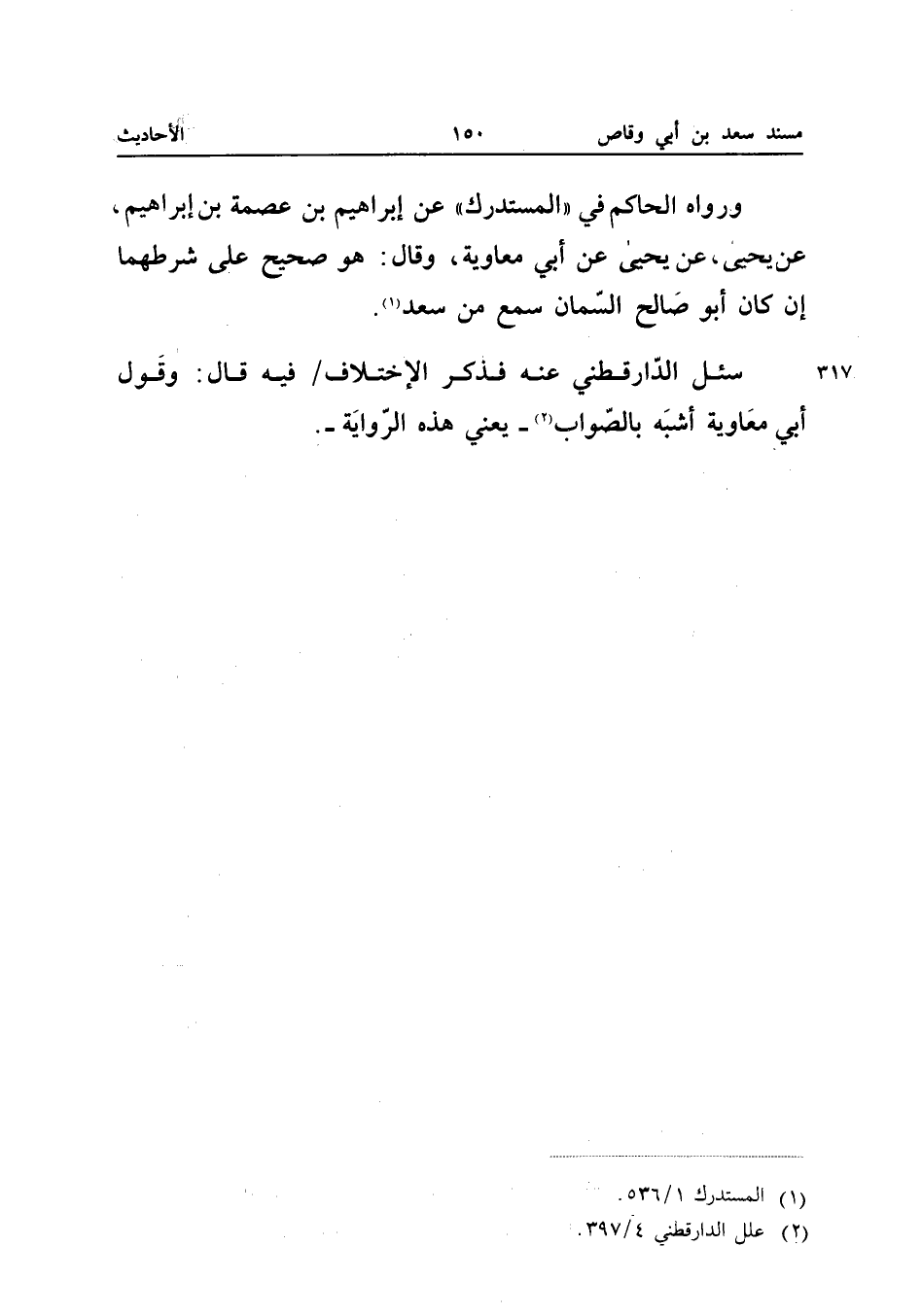 وَرَوَاهُ الْحَاكِمُ فِي الْمُسْتَدْرَكِ عَنْ إِبْرَاهِيمَ بْنِ عصمَة بن إِبْرَاهِيم عَن يحيى عَن يَحْيَى عَنْ أَبِي مُعَاوِيَةَ وَقَالَ هُوَ صَحِيحٌ عَلَى شَرْطِهِمَا إِنْ كَانَ أَبُو صَالِحٍ السَّمَّانُ سَمِعَ مِنْ سَعْدٍ سُئِلَ الدَّارَقُطْنِيُّ عَنْهُ فَذَكَرَ الاخْتِلافَ فِيهِ قَالَ وَقَوْلُ أَبِي مُعَاوِيَةَ أَشْبَهُ بِالصَّوَابِ يَعْنِي هَذِه الرِّوَايَة (إِسْنَاده صَحِيح)