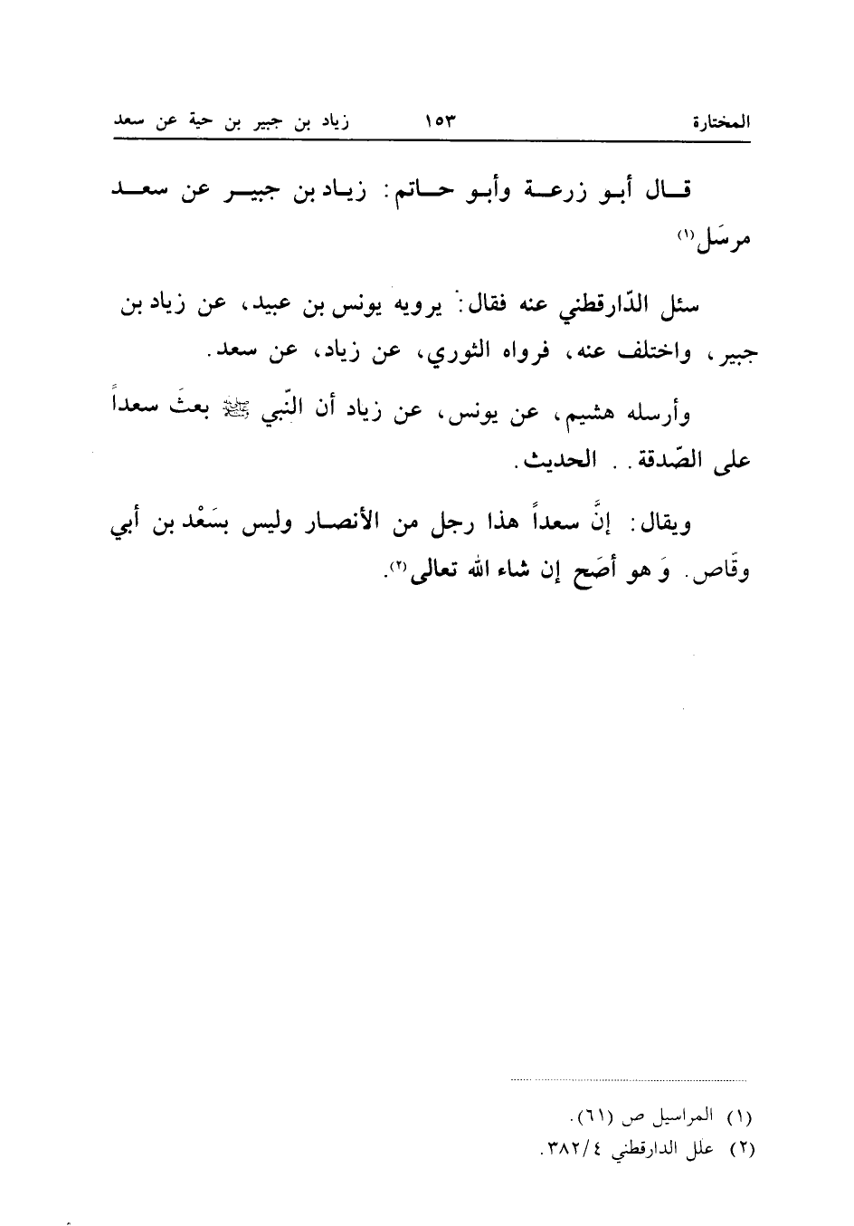 قَالَ أَبُو زُرْعَةَ وَأَبُو حَاتِمٍ زِيَادُ بْنُ جُبَيْرٍ عَنْ سَعْدٍ مُرْسَلٌ سُئِلَ الدَّارَقُطْنِيُّ عَنْهُ فَقَالَ يَرْوِيهِ يُونُسُ بْنُ عُبَيْدٍ عَنْ زِيَادِ بْنِ جُبَيْرٍ وَاخْتُلِفَ عَنْهُ فَرَوَاهُ الثَّوْرِيُّ عَنْ زِيَادٍ عَنْ سَعْدٍ وَأَرْسَلَهُ هُشَيْمٌ عَنْ يُونُسَ عَنْ زِيَادٍ أَنَّ النَّبِيَّ صَلَّى اللَّهُ عَلَيْهِ وَسَلَّمَ بَعَثَ سَعْدًا عَلَى الصَّدَقَةِ الْحَدِيثَ وَيُقَالُ إِنَّ سَعْدًا هَذَا رَجُلٌ مِنَ الأَنْصَارِ وَلَيْسَ بِسَعْدِ بْنِ أَبِي وَقَّاصٍ وَهُوَ أَصَحُّ إِنْ شَاءَ الله تَعَالَى (إِسْنَاده ضَعِيف)