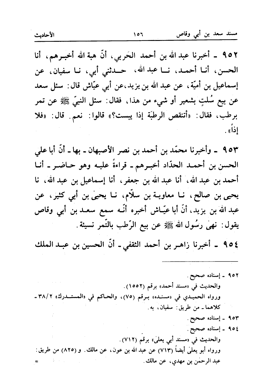 952 - أخبرنَا عبد الله بْنُ أَحْمَدَ الْحَرْبِيُّ أَنَّ هِبَةَ اللَّهِ أَخْبَرَهُمْ أَنا الْحسن أَنا أَحْمد نَا عبد الله حَدَّثَنِي أَبِي نَا سُفْيَانُ عَنْ إِسْمَاعِيلَ بْنِ أُميَّة عَن عبد الله بْنِ يَزِيدَ عَنْ أَبِي عَيَّاشٍ قَالَ سُئِلَ سَعْدٌ عَنْ بَيْعِ سُلْتٍ بِشَعِيرٍ أَوْ شَيْءٍ مِنْ هَذَا فَقَالَ سُئِلَ النَّبِيُّ صَلَّى اللَّهُ عَلَيْهِ وَسَلَّمَ عَنْ تَمْرٍ بِرُطَبٍ فَقَالَ أَتَنْقُصُ الرُّطَبَةُ إِذَا يَبِسَتْ قَالُوا نَعَمْ قَالَ فَلا إِذا (إِسْنَاده صَحِيح)
