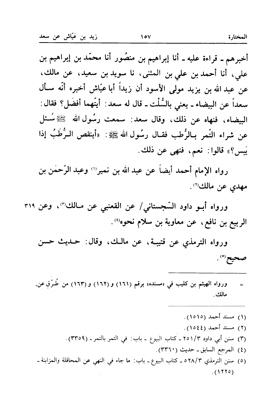 أَخْبَرَهُمْ قِرَاءَةً عَلَيْهِ أَنا إِبْرَاهِيمُ بْنُ مَنْصُورٍ أَنَا مُحَمَّدُ بْنُ إِبْرَاهِيمَ بْنِ عَلِيٍّ أَنَا أَحْمَدُ بْنُ عَلِيِّ بْنِ الْمُثَنَّى نَا سُوَيْدُ بن سعيد عَن مَالك عَن عبد الله بْنِ يَزِيدَ مَوْلَى الأَسْوَدِ أَنَّ زَيْدًا أَبَا عَيَّاشٍ أَخْبَرَهُ أَنَّهُ سَأَلَ سَعْدًا عَنِ الْبَيْضَاءِ يَعْنِي بِالسُّلْتِ قَالَ لَهُ سَعْدٌ أَيَّتُهُمَا أَفْضَلُ فَقَالَ الْبَيْضَاءُ فَنَهَاهُ عَنْ ذَلِكَ وَقَالَ سَعْدٌ سَمِعْتُ رَسُولَ اللَّهِ صَلَّى اللَّهُ عَلَيْهِ وَسَلَّمَ سُئِلَ عَنْ شِرَاءِ التَّمْرِ بِالرُّطَبِ فَقَالَ رَسُولُ اللَّهِ صَلَّى اللَّهُ عَلَيْهِ وَسَلَّمَ أَيَنْقُصُ الرُّطَبُ إِذَا يَبِسَ قَالُوا نَعَمْ فَنَهَى عَنْ ذَلِكَ رَوَاهُ الإِمَام أَحْمد أَيْضا عَن عبد الله بن نمير وَعبد الرَّحْمَن بْنِ مَهْدِيٍّ عَنْ مَالِكٍ وَرَوَاهُ أَبُو دَاوُدَ السِّجِسْتَانِيُّ عَنِ الْقَعْنَبِيِّ عَنْ مَالِكٍ وَعَنِ الرَّبِيعِ بْنِ نَافِعٍ عَنْ مُعَاوِيَةَ بْنِ سَلامٍ نَحْوَهُ وَرَوَاهُ التِّرْمِذِيُّ عَنْ قُتَيْبَةَ عَنْ مَالِكٍ وَقَالَ حَدِيثٌ حَسَنٌ صَحِيحٌ