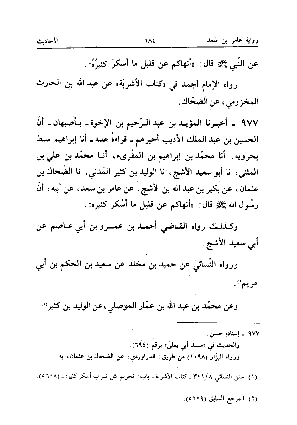 977 - أخبرنَا الْمُؤَيد بن عبد الرَّحِيم بن الْإِخْوَة بأصبهان أَن الْحُسَيْن بن عبد الْملك الأَدِيبَ أَخْبَرَهُمْ قِرَاءَةً عَلَيْهِ أَنا إِبْرَاهِيمُ سِبْطُ بحرويه أَنا مُحَمَّد بن إِبْرَاهِيم بن المقرىء أَنا مُحَمَّدُ بْنُ عَلِيِّ بْنِ الْمُثَنَّى نَا أَبُو سَعِيدٍ الأَشَجُّ نَا الْوَلِيدُ بْنُ كَثِيرٍ الْمَدَنِيُّ نَا الضَّحَّاكُ بْنُ عُثْمَانَ عَنْ بُكَيْرِ بن عبد الله بْنِ الأَشَجِّ عَنْ عَامِرِ بْنِ سَعْدٍ عَنْ أَبِيهِ أَنَّ رَسُولَ اللَّهِ صَلَّى اللَّهُ عَلَيْهِ وَسَلَّمَ قَالَ أَنْهَاكُمْ عَنْ قَلِيلِ مَا أَسْكَرَ كَثِيرُهُ وَكَذَلِكَ رَوَاهُ الْقَاضِي أَحْمَدُ بْنُ عَمْرِو بْنِ أَبِي عَاصِمٍ عَنْ أَبِي سَعِيدٍ الأَشَجِّ وَرَوَاهُ النَّسَائِيُّ عَنْ حُمَيْدِ بْنِ مَخْلَدٍ عَنْ سَعِيدِ بْنِ الْحَكَمِ بْنِ أَبِي مَرْيَمَ وَعَنْ مُحَمَّد بن عبد الله بْنِ عَمَّارٍ الْمَوْصِلِيِّ عَنِ الْوَلِيدِ بْنِ كَثِيرٍ