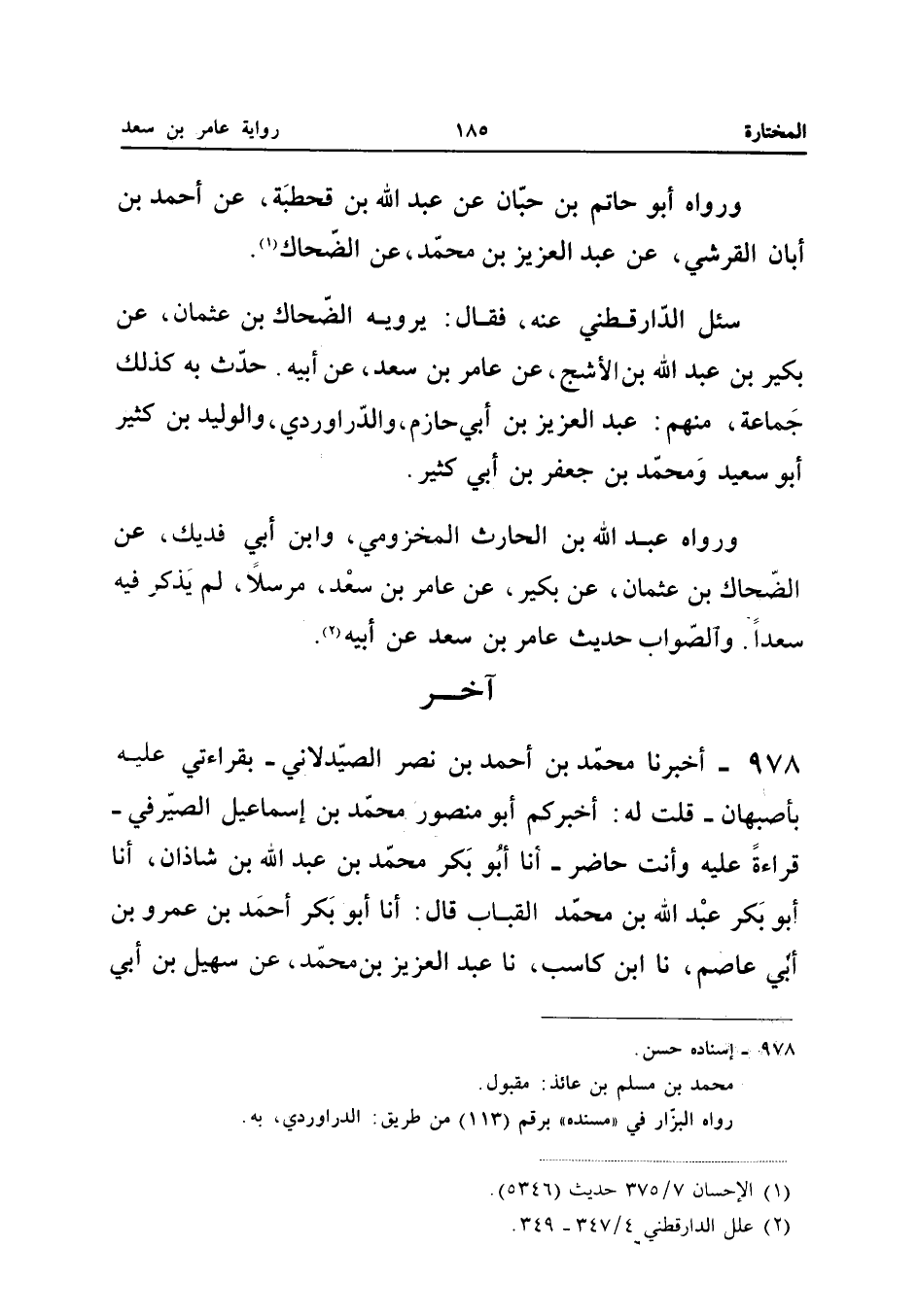 وَرَوَاهُ أَبُو حَاتِم بن حبَان عَن عبد الله بْنِ قَحْطَبَةَ عَنْ أَحْمَدَ بْنِ أَبَانٍ الْقُرَشِيُّ عَن عبد الْعَزِيز بْنِ مُحَمَّدٍ عَنِ الضَّحَّاكِ سُئِلَ الدَّارَقُطْنِيُّ عَنْهُ فَقَالَ يَرْوِيهِ الضَّحَّاكُ بْنُ عُثْمَانَ عَنْ بُكَيْرِ بن عبد الله بْنِ الأَشَجِّ عَنْ عَامِرِ بْنِ سَعْدٍ عَنْ أَبِيه حدث بِهِ كَذَلِك جمَاعَة مِنْهُم عبد الْعَزِيز بْنُ أَبِي حَازِمٍ وَالدَّرَاوَرْدِيُّ وَالْوَلِيدُ بْنُ كَثِيرٍ أَبُو سَعِيدٍ وَمُحَمَّدُ بْنُ جَعْفَرِ بْنِ أَبِي كثير وَرَوَاهُ عبد الله بْنُ الْحَارِثِ الْمَخْزُومِيُّ وَابْنُ أَبِي فُدَيْكٍ عَنِ الضَّحَّاكِ بْنِ عُثْمَانَ عَنْ بُكَيْرٍ عَنْ عَامِرِ بْنِ سَعْدٍ مُرْسَلا لَمْ يَذْكُرْ فِيهِ سَعْدًا وَالصَّوَابُ حَدِيثُ عَامِرِ بْنِ سَعْدٍ عَنْ أَبِيهِ (إِسْنَاده حسن)