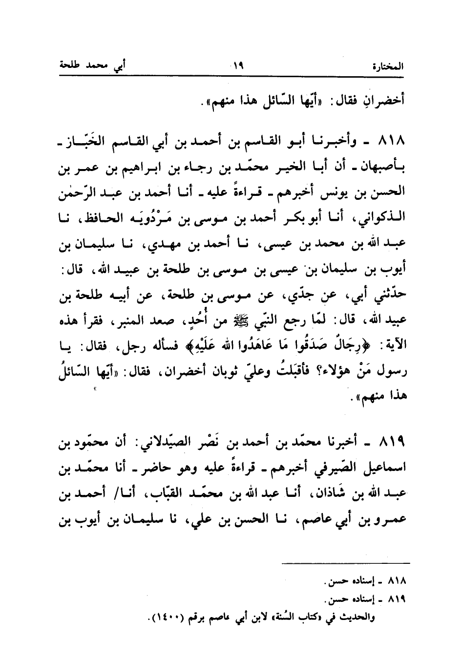 818 - وَأَخْبَرَنَا أَبُو الْقَاسِمِ بْنُ أَحْمَدَ بْنِ أَبِي الْقَاسِمِ الْخَبَّازُ بِأَصْبَهَانَ أَنَّ أَبَا الْخَيْرِ مُحَمَّدَ بْنُ رَجَاءِ بْنِ إِبْرَاهِيمَ بْنِ عُمَرَ بْنِ الْحَسَنِ بْنِ يُونُسَ أَخْبَرَهُمْ قِرَاءَةً عَلَيْهِ أَنَا أَحْمد بن عبد الرَّحْمَن الذَّكْوَانِيُّ أَنا أَبُو بَكْرٍ أَحْمَدُ بْنُ مُوسَى بن مرْدَوَيْه الْحَافِظ نَا عبد الله بْنُ مُحَمَّدِ بْنِ عِيسَى نَا أَحْمَدُ بْنُ مَهْدِيٍّ نَا سُلَيْمَانُ بْنُ أَيُّوبَ بْنِ سُلَيْمَانَ بْنِ عِيسَى بْنِ مُوسَى بْنِ طَلْحَةَ بْنِ عبيد الله قَالَ حَدَّثَنِي أَبِي عَنْ جَدِّي عَنْ مُوسَى بن طَلْحَة عَن أَبِيه طَلْحَة بن عبيد الله قَالَ لَمَّا رَجَعَ النَّبِيُّ صَلَّى اللَّهُ عَلَيْهِ وَسَلَّمَ مِنْ أُحُدٍ صَعِدَ الْمِنْبَرَ فَقَرَأَ هَذِهِ الآيَةَ رِجَالٌ صَدَقُوا مَا عَاهَدُوا اللَّهَ عَلَيْهِ فَسَأَلَهُ رجل فَقَالَ يَا رَسُول مَنْ هَؤُلاءِ فَأَقْبَلْتُ وَعَلَيَّ ثَوْبَانِ أَخْضَرَانِ فَقَالَ أَيهَا السَّائِل هَذَا مِنْهُم (إِسْنَاده حس)