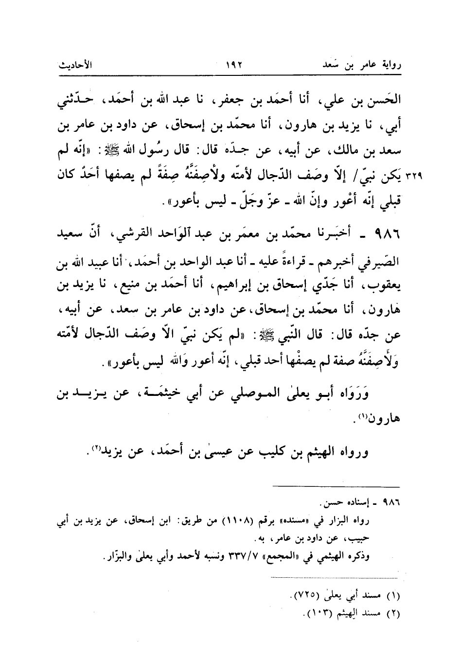 986 - أخبرنَا مُحَمَّد بن معمر بن عبد الْوَاحِد الْقرشِي أَنَّ سَعِيدَ الصَّيْرَفِيَّ أَخْبَرَهُمْ قِرَاءَةً عَلَيْهِ أَنَا عبد الْوَاحِد بْنُ أَحْمَدَ أَنا عُبَيْدُ اللَّهِ بْنُ يَعْقُوبَ أَنا جَدِّي إِسْحَاقُ بْنُ إِبْرَاهِيمَ أَنا أَحْمَدُ بْنُ مَنِيعٍ نَا يَزِيدُ بْنُ هَارُونَ أَنا مُحَمَّدُ بْنُ إِسْحَاقَ عَنْ دَاوُدَ بْنِ عَامِرِ بْنِ سَعْدٍ عَنْ أَبِيهِ عَنْ جَدِّهِ قَالَ قَالَ النَّبِيُّ صَلَّى اللَّهُ عَلَيْهِ وَسَلَّمَ لَمْ يَكُنْ نَبِيٌّ إِلا وَصَفَ الدَّجَّالَ لأُمَّتِهِ وَلأَصِفَنَّهُ صِفَةً لَمْ يَصِفْهَا أَحَدٌ قَبْلِي إِنَّهُ أَعْوَرُ وَاللَّهُ لَيْسَ بِأَعْوَرَ وَرَوَاهُ أَبُو يَعْلَى الْمَوْصِلِيُّ عَنْ أَبِي خَيْثَمَةَ عَنْ يَزِيدَ بْنِ هَارُونَ وَرَوَاهُ الْهَيْثَمُ بْنُ كُلَيْبٍ عَنْ عِيسَى بْنِ أَحْمَدَ عَنْ يَزِيدَ وَرَوَاهُ الْحَارِثُ بْنُ أَبِي أُسَامَة عَن يزِيد وَفِيه زِيَادَة (إِسْنَاده حسن)