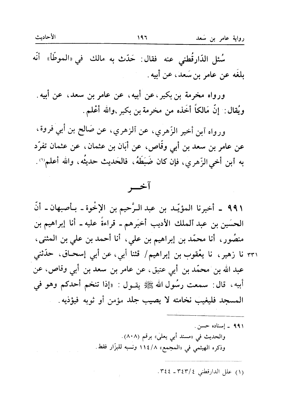 سُئِلَ الدَّارَقُطْنِيُّ عَنْهُ فَقَالَ حَدَّثَ بِهِ مَالِكٌ فِي الْمُوَطَّإِ أَنَّهُ بَلَغَهُ عَنْ عَامِرِ بْنِ سَعْدٍ عَنْ أَبِيهِ وَرَوَاهُ مَخْرَمَةُ بْنُ بُكَيْرٍ عَنْ أَبِيهِ عَنْ عَامِرِ بْنِ سَعْدٍ عَنْ أَبِيهِ وَيُقَالُ إِنَّ مَالِكًا أَخَذَهُ مِنْ مَخْرَمَةَ بن بكير وَالله أعلم وَرَوَاهُ ابْن أخير الزُّهْرِيِّ عَنِ الزُّهْرِيِّ عَنْ صَالِحِ بْنِ أَبِي فَرْوَةَ عَنْ عَامِرِ بْنِ سَعْدِ بْنِ أَبِي وَقَّاصٍ عَنْ أَبَانِ بْنِ عُثْمَانَ عَنْ عُثْمَانَ تَفَرَّدَ بِهِ ابْنُ أَخِي الزُّهْرِيِّ فَإِنْ كَانَ ضَبطه فَالْحَدِيث حَدِيثه وَالله أعلم (إِسْنَاده صَحِيح)