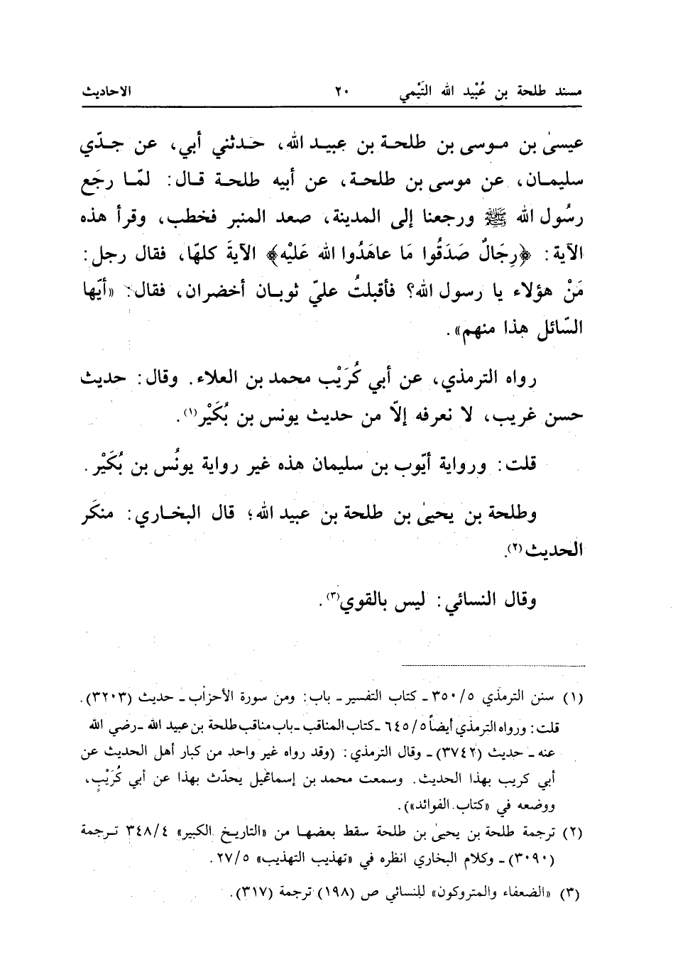 عِيسَى بْنِ مُوسَى بْنِ طَلْحَةَ بْنِ عبيد الله حَدَّثَنِي أَبِي عَنْ جَدِّي سُلَيْمَانَ عَنْ مُوسَى بْنِ طَلْحَةَ عَنْ أَبِيهِ طَلْحَةَ قَالَ لَمَّا رَجَعَ رَسُولُ اللَّهِ صَلَّى اللَّهُ عَلَيْهِ وَسَلَّمَ وَرَجَعْنَا إِلَى الْمَدِينَةِ صَعِدَ الْمِنْبَرَ فَخَطَبَ وَقَرَأَ هَذِهِ الآيَةَ {رِجَالٌ صَدَقُوا مَا عَاهَدُوا اللَّهَ عَلَيْهِ} الآيَةَ كُلَّهَا فَقَالَ رَجُلٌ مَنْ هَؤُلاءِ يَا رَسُولَ اللَّهِ فَأَقْبَلْتُ عَلَيَّ ثَوْبَانِ أَخْضَرَانِ فَقَالَ أَيُّهَا السَّائِلُ هَذَا مِنْهُمْ رَوَاهُ التِّرْمِذِيُّ عَنْ أَبِي كُرَيْبٍ مُحَمَّدِ بْنِ الْعَلاءِ وَقَالَ حَدِيثٌ حَسَنٌ غَرِيبٌ لَا نَعْرِفُهُ إِلا مِنْ حَدِيثِ يُونُسَ بْنِ بُكَيْرٍ قُلْتُ وَرِوَايَةُ أَيُّوبَ بْنِ سُلَيْمَانَ هَذِهِ غَيْرُ رِوَايَةِ يُونُسَ بْنِ بُكَيْرٍ وَطَلْحَة بن يحيى بن طَلْحَة بن عبيد الله قَالَ الْبُخَارِيُّ مُنْكَرٌ الْحَدِيثُ وَقَالَ النَّسَائِيُّ لَيْسَ بِالْقَوِيّ