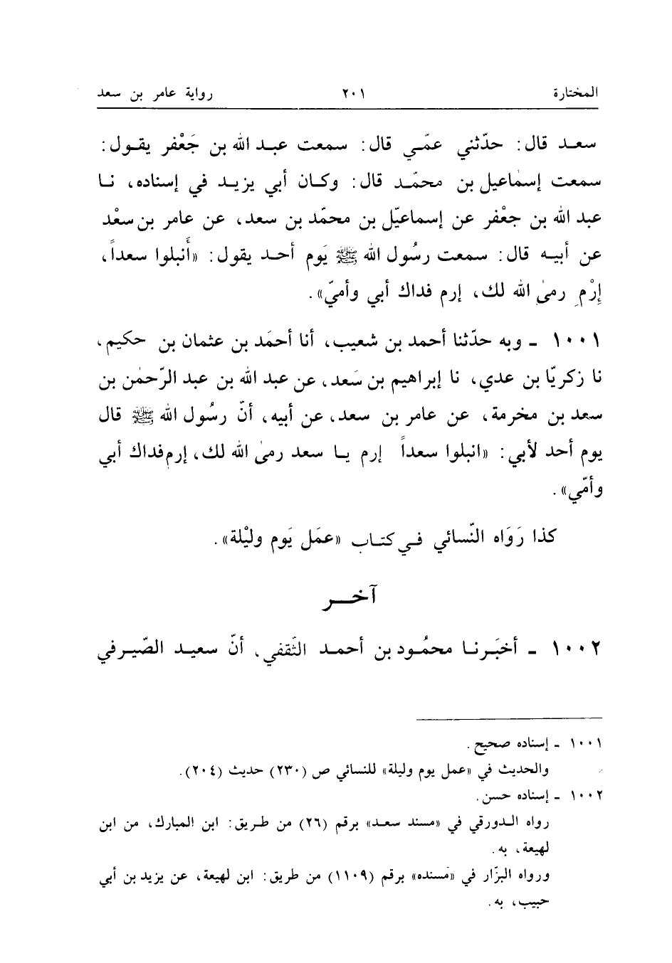 1001 - وَبِهِ حَدَّثَنَا أَحْمَدُ بْنُ شُعَيْبٍ أَنا أَحْمَدُ بْنُ عُثْمَانَ بْنِ حَكِيمٍ نَا زَكَرِيَّا بْنُ عدي نَا إِبْرَاهِيم بن سعد عَن عبد الله بن عبد الرَّحْمَن بْنِ سَعْدِ بْنِ مَخْرَمَةَ عَنْ عَامِرِ بْنِ سَعْدٍ عَنْ أَبِيهِ أَنَّ رَسُولَ اللَّهِ صَلَّى اللَّهُ عَلَيْهِ وَسَلَّمَ قَالَ يَوْمَ أُحُدٍ لأَبِي أنْبلُوا سَعْدًا ارْمِ يَا سَعْدُ رَمَى اللَّهُ لَكَ ارْمِ فِدَاكَ أَبِي وَأُمِّي كَذَا رَوَاهُ النَّسَائِيّ فِي كتاب عمل يَوْم وَلَيْلَة (إِسْنَاده صَحِيح)