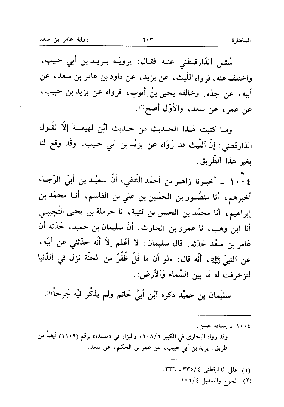 1004 - أَخْبَرَنَا زَاهِرُ بْنُ أَحْمَدَ الثَّقَفِيُّ أَنَّ سَعِيدَ بْنَ أَبِي الرَّجَاءِ أَخْبَرَهُمْ أَنا مَنْصُورُ بْنُ الْحُسَيْنِ بْنِ عَلِيِّ بْنِ الْقَاسِمِ أَنا مُحَمَّدُ بْنُ إِبْرَاهِيمَ أَنا مُحَمَّدُ بْنُ الْحَسَنِ بْنِ قُتَيْبَةَ نَا حَرْمَلَةُ بْنُ يَحْيَى التُّجِيبِيُّ أَنا ابْنُ وَهْبٍ نَا عَمْرُو بْنُ الْحَارِثِ أَنَّ سُلَيْمَانَ بْنَ حُمَيْدٍ حَدَّثَهُ أَنَّ عَامِرَ بْنَ سَعْدٍ حَدَّثَهُ قَالَ سُلَيْمَانُ لَا أَعْلَمُ إِلا أَنَّهُ حَدَّثَنِي عَنْ أَبِيهِ عَنِ النَّبِيِّ صَلَّى اللَّهُ عَلَيْهِ وَسَلَّمَ أَنَّهُ قَالَ لَوْ أَنَّ مَا قَلَّ ظُفُرٌ مِنَ الْجَنَّةِ نَزَلَ فِي الدُّنْيَا لَتَزَخْرَفَتْ لَهُ مَا بَيْنَ السَّمَاءِ وَالأَرْضِ سُلَيْمَانُ بْنُ حُمَيْدٍ ذَكَرَهُ ابْنُ أَبِي حَاتِمٍ وَلم يذكر فِيهِ جرحا (إِسْنَاده حسن)