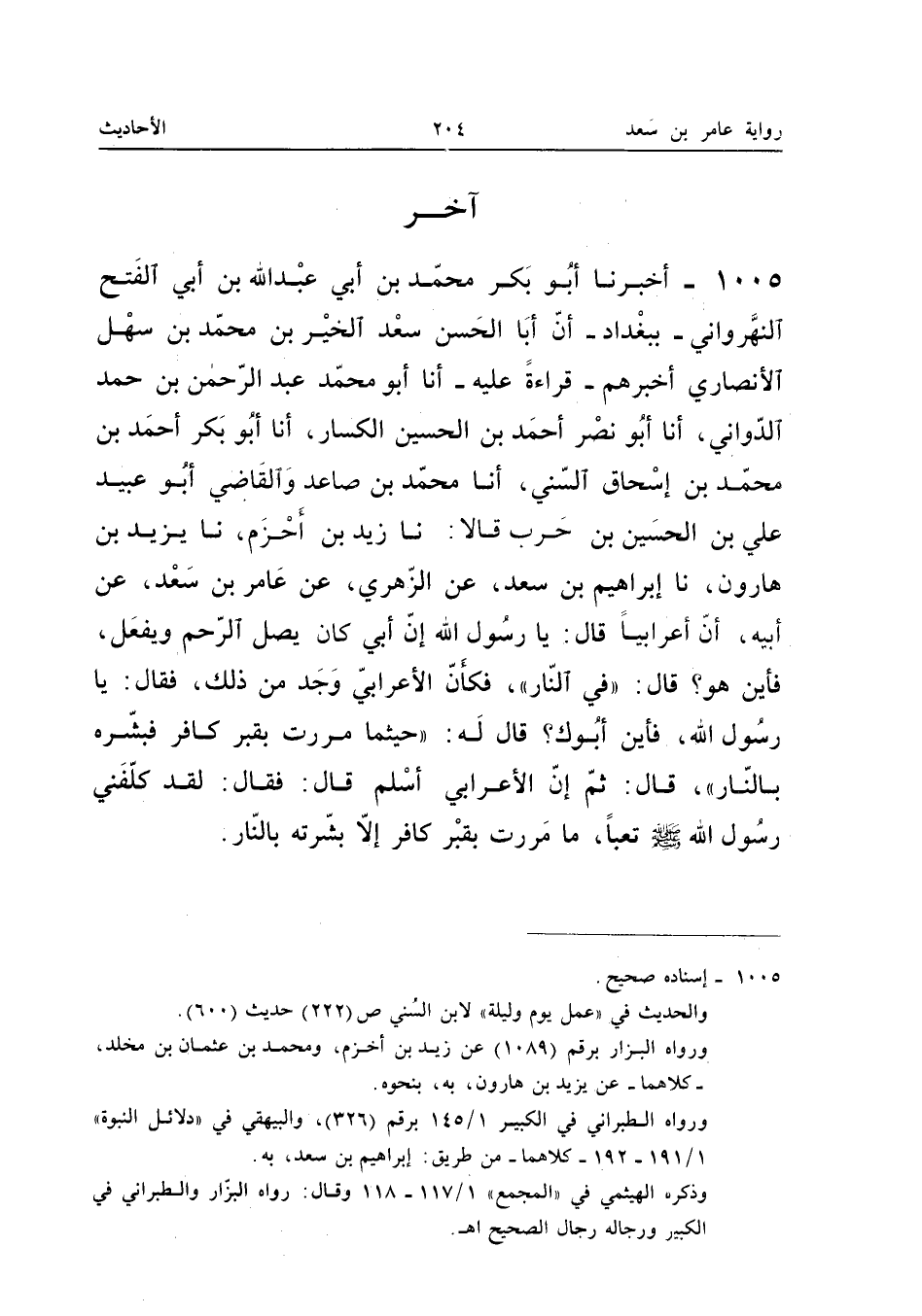 1005 - أَخْبَرَنَا أَبُو بَكْرٍ مُحَمَّدُ بْنُ أَبِي عبد الله بْنِ أَبِي الْفَتْحِ النَّهْرَوَانِيُّ بِبَغْدَادَ أَنَّ أَبَا الْحَسَنِ سَعْدَ الْخَيْرِ بْنَ مُحَمَّدِ بْنِ سَهْلٍ الأَنْصَارِيَّ أَخْبَرَهُمْ قِرَاءَةً عَلَيْهِ أَنا أَبُو مُحَمَّدٍ عبد الرَّحْمَن بن حمد الدواني أَنا أَبُو نَصْرٍ أَحْمَدُ بْنُ الْحُسَيْنِ الْكَسَّارُ أَنا أَبُو بَكْرٍ أَحْمَدُ بْنُ مُحَمَّدِ بْنِ إِسْحَاقَ السُّنِّيُّ أَنا مُحَمَّدُ بْنُ صَاعِدٍ وَالْقَاضِي أَبُو عُبَيْدٍ عَلِيُّ بْنُ الْحُسَيْنِ بْنِ حَرْبٍ قَالا نَا زَيْدُ بْنُ أَحْزَمَ نَا يَزِيدُ بْنُ هَارُونَ نَا إِبْرَاهِيمُ بْنُ سَعْدٍ عَنِ الزُّهْرِيِّ عَنْ عَامِرِ بْنِ سَعْدٍ عَنْ أَبِيهِ أَنَّ أَعْرَابِيًّا قَالَ يَا رَسُولَ اللَّهِ إِنَّ أَبِي كَانَ يَصِلُ الرَّحِمَ وَيَفْعَلُ فَأَيْنَ هُوَ قَالَ فِي النَّارِ فَكَأَنَّ الأَعْرَابِيَّ وَجَدَ مِنْ ذَلِكَ فَقَالَ يَا رَسُولَ اللَّهِ فَأَيْنَ أَبُوكَ قَالَ لَهُ حَيْثُمَا مَرَرْتَ بِقَبْرِ كَافِرٍ فَبَشِّرْهُ بِالنَّارِ قَالَ ثُمَّ إِنَّ الأَعْرَابِيَّ أَسْلَمَ قَالَ فَقَالَ لَقَدْ كَلَّفَنِي رَسُولُ اللَّهِ صَلَّى اللَّهُ عَلَيْهِ وَسَلَّمَ تَعَبًا مَا مَرَرْتُ بِقَبْرِ كَافِرٍ إِلا بَشَّرْتُهُ بِالنَّارِ