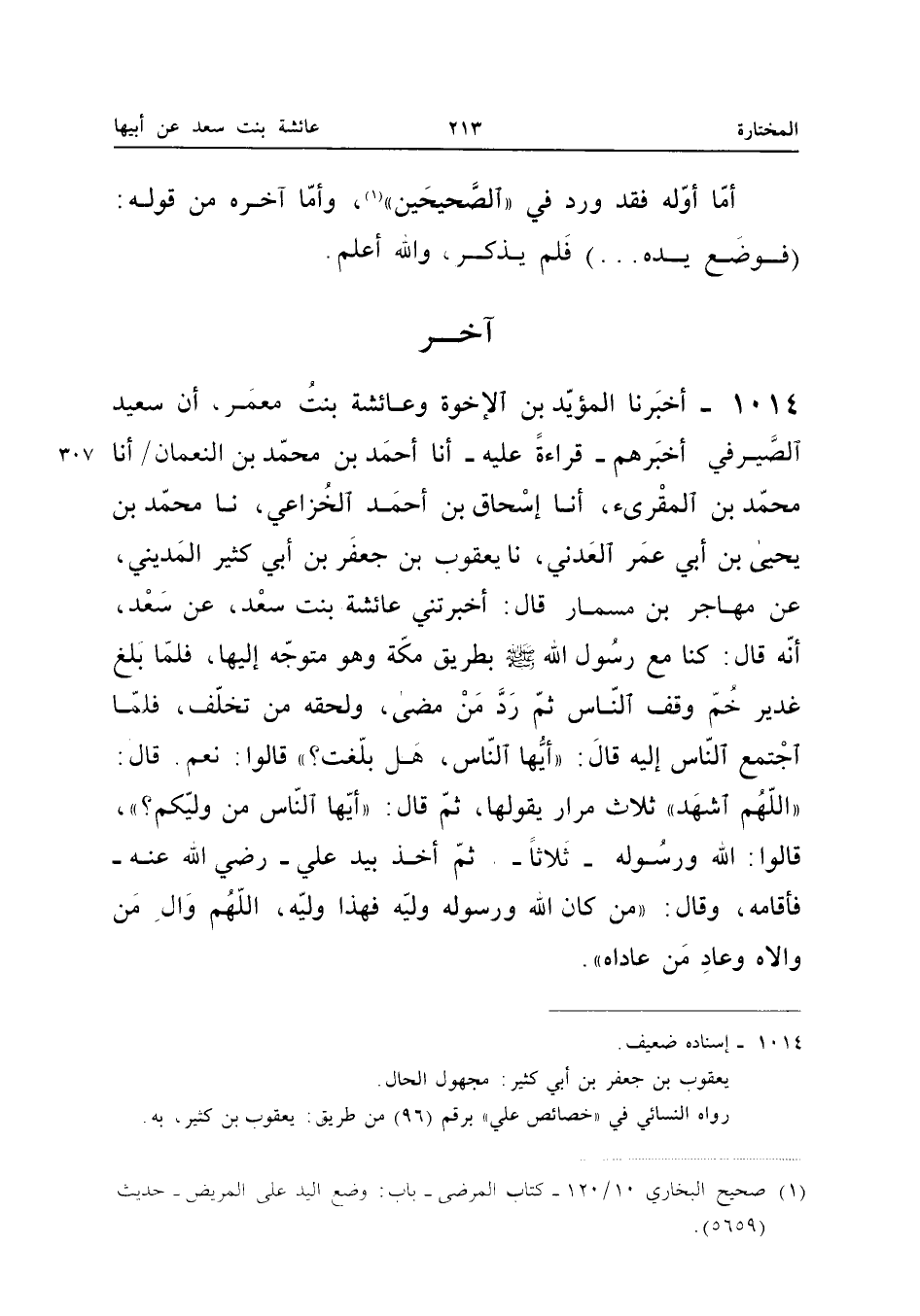 1014 - أخبرنَا الْمُؤَيد بن الْإِخْوَة وَعَائِشَة بنت معمر أَنَّ سَعِيدَ الصَّيْرَفِيَّ أَخْبَرَهُمْ قِرَاءَةً عَلَيْهِ أَنَا أَحْمَدُ بْنُ مُحَمَّدِ بْنِ النُّعْمَانِ أَنا مُحَمَّدُ بن الْمُقْرِئِ أَنا إِسْحَاقُ بْنُ أَحْمَدَ الْخُزَاعِيُّ نَا مُحَمَّدُ بْنُ يَحْيَى بْنِ أَبِي عُمَرَ الْعَدَنِيُّ نَا يَعْقُوبُ بْنُ جَعْفَرِ بْنِ أَبِي كَثِيرٍ الْمَدِينِيُّ عَنْ مُهَاجِرِ بْنِ مِسْمَارٍ قَالَ أَخْبَرَتْنِي عَائِشَةُ بِنْتُ سَعْدٍ عَنْ سَعْدٍ أَنَّهُ قَالَ كُنَّا مَعَ رَسُولِ اللَّهِ صَلَّى اللَّهُ عَلَيْهِ وَسَلَّمَ بِطَرِيقِ مَكَّةَ وَهُوَ مُتَوَجِّهٌ إِلَيْهَا فَلَمَّا بَلَغَ غَدِيرَ خُمٍّ وَقَفَ النَّاسُ ثُمَّ رَدَّ مَنْ مَضَى وَلَحِقَهُ مَنْ تَخَلَّفَ فَلَمَّا اجْتَمَعَ النَّاسُ إِلَيْهِ قَالَ أَيُّهَا النَّاسُ هَلْ بَلَّغْتُ قَالُوا نَعَمْ قَالَ اللَّهُمَّ اشْهَدْ ثَلاثَ مِرَارٍ يَقُولُهَا ثُمَّ قَالَ أَيُّهَا النَّاسُ مَنْ وَلِيُّكُمْ قَالُوا اللَّهُ وَرَسُولُهُ ثَلاثًا ثُمَّ أَخَذَ بِيَدِ عَلِيٍّ رَضِيَ اللَّهُ عَنْهُ فَأَقَامَهُ وَقَالَ مَنْ كَانَ اللَّهُ وَرَسُولُهُ وَلِيَّهُ فَهَذَا وَلِيُّهُ اللَّهُمَّ وَال من وَالَاهُ وَعَاد من عَادَاهُ (إِسْنَاده ضَعِيف)