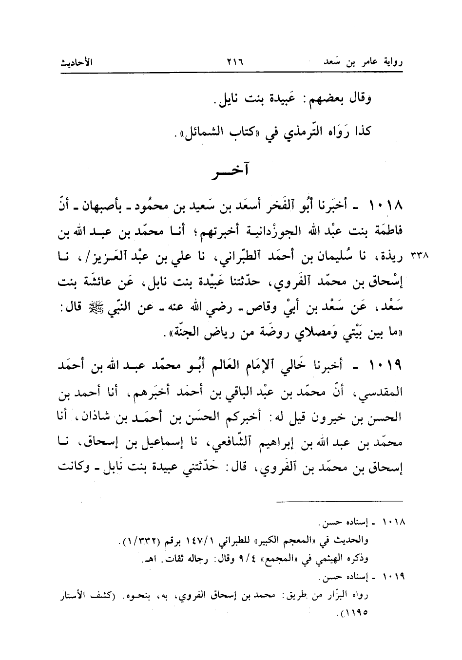 1018 - أخبرنَا أبوالفخر أَسْعَدُ بْنُ سَعِيدِ بْنِ مَحْمُودٍ بِأَصْبَهَانَ أَنَّ فَاطِمَة بنت عبد الله الجوزدانية أَخْبَرتهم أَنا مُحَمَّد بن عبد الله بن ريذة نَا سُلَيْمَانُ بْنُ أَحْمَدَ الطَّبَرَانِيُّ نَا عَلِيُّ بْنُ عبد الْعَزِيز نَا إِسْحَاقُ بْنُ مُحَمَّدٍ الْفَرْوِيُّ حَدَّثَتْنَا عُبَيْدَةُ بِنْتُ نَابِلٍ عَنْ عَائِشَةَ بِنْتِ سَعْدٍ عَنْ سَعْدِ بْنِ أَبِي وَقَّاصٍ رَضِيَ اللَّهُ عَنْهُ عَنِ النَّبِيِّ صَلَّى اللَّهُ عَلَيْهِ وَسَلَّمَ قَالَ مَا بَيْنَ بَيْتِي وَمُصَلايَ رَوْضَةٌ مِنْ رِيَاضِ الْجنَّة (إِسْنَاده حسن)