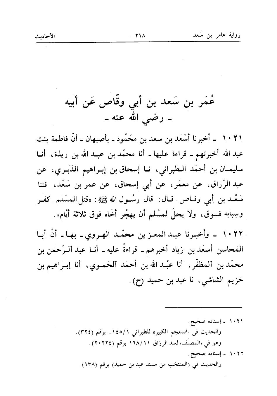 1021 - أَخْبَرَنَا أَسْعَدُ بْنُ سَعْدِ بْنِ مَحْمُودٍ بِأَصْبَهَانَ أَنَّ فَاطِمَةَ بِنْتَ عبد الله أَخْبَرتهم قِرَاءَة عَلَيْهَا أَنا مُحَمَّد بن عبد الله بْنِ رِيذَةَ أَنَا سُلَيْمَانُ بْنُ أَحْمَدَ الطَّبَرَانِيُّ نَا إِسْحَاق بن إِبْرَاهِيم الدبرِي عَن عبد الرَّزَّاق عَنْ مَعْمَرٍ عَنْ أَبِي إِسْحَاقَ عَنْ عُمَرَ بْنِ سَعْدٍ قثنا سَعْدُ بْنُ أَبِي وَقَّاصٍ قَالَ قَالَ رَسُولُ اللَّهِ صَلَّى اللَّهُ عَلَيْهِ وَسَلَّمَ قَتْلُ الْمُسْلِمِ كُفْرٌ وَسِبَابُهُ فُسُوقٌ وَلا يَحِلُّ لِمُسْلِمٍ أَنْ يَهْجُرَ أَخَاهُ فَوْقَ ثَلاثَةِ أَيَّام (إِسْنَاده صَحِيح)