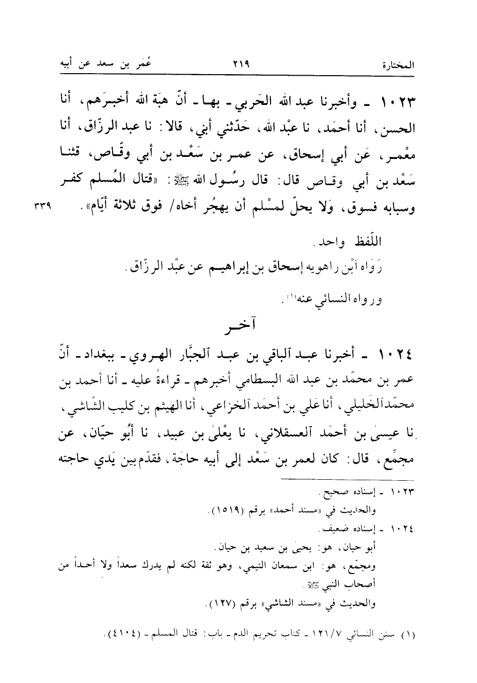 1023 - وَأخْبرنَا عبد الله الْحَرْبِيُّ بِهَا أَنَّ هِبَةَ اللَّهِ أَخْبَرَهُمْ أَنا الْحسن أَنا أَحْمد نَا عبد الله حَدثنِي أبي قَالَا نَا عبد الرَّزَّاق أَنا مَعْمَرٌ عَنْ أَبِي إِسْحَاقَ عَنْ عُمَرَ بْنِ سَعْدِ بْنِ أَبِي وَقَّاصٍ قثنا سَعْدُ بْنِ أَبِي وَقَّاصٍ قَالَ قَالَ رَسُولُ اللَّهِ صَلَّى اللَّهُ عَلَيْهِ وَسَلَّمَ قِتَالُ الْمُسْلِمِ كُفْرٌ وَسِبَابُهُ فُسُوقٌ وَلا يَحِلُّ لِمُسْلِمٍ أَنْ يَهْجُرَ أَخَاهُ فَوْقَ ثَلاثَةِ أَيَّامٍ اللَّفْظُ وَاحِدٌ رَوَاهُ ابْن رَاهَوَيْه إِسْحَاق بن إِبْرَاهِيم عَن عبد الرَّزَّاق وَرَوَاهُ النَّسَائِيّ عَنهُ (إِسْنَاده صَحِيح)