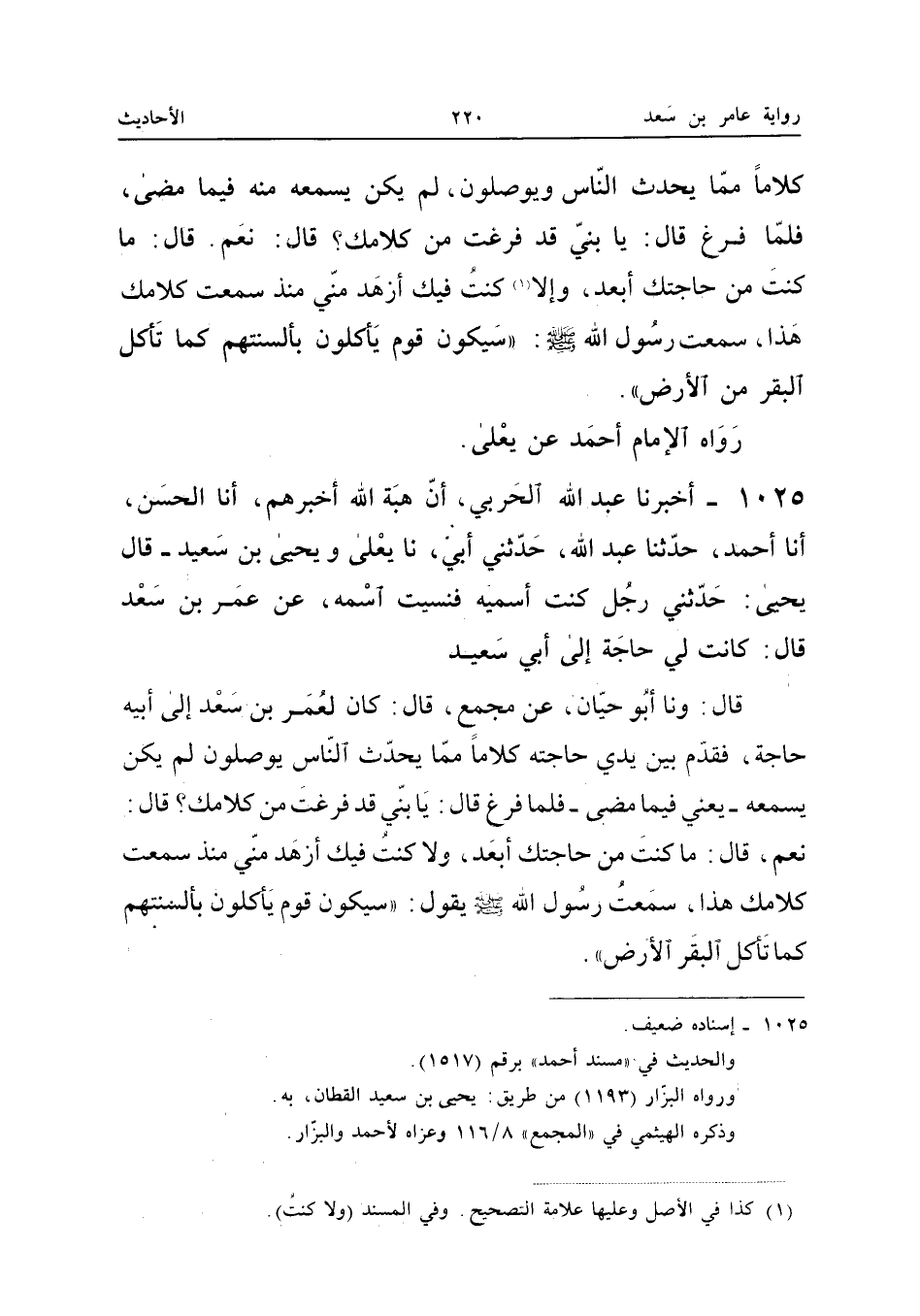 1025 - أخبرنَا عبد الله الْحَرْبِيُّ أَنَّ هِبَةَ اللَّهِ أَخْبَرَهُمْ أَنَا الْحَسَنُ أَنا أَحْمد حَدثنَا عبد الله حَدَّثَنِي أَبِي نَا يَعْلَى وَيَحْيَى بْنُ سَعِيدٍ قَالَ يَحْيَى حَدَّثَنِي رَجُلٌ كُنْتُ أُسَمِّيهِ فَنَسِيتُ اسْمَهُ عَنْ عُمَرَ بْنِ سَعْدٍ قَالَ كَانَتْ لِي حَاجَةٌ إِلَى أَبِي سَعِيدٍ قَالَ وَنا أَبُو حَيَّانَ عَنْ مُجَمِّعٍ قَالَ كَانَ لِعُمَرَ بْنِ سَعْدٍ إِلَى أَبِيهِ حَاجَةٌ فَقَدَّمَ بَيْنَ يَدي حَاجته كلَاما مِمَّا يحدث النَّاس يوصلون لَمْ يَكُنْ يَسْمَعُهُ يَعْنِي فِيمَا مَضَى فَلَمَّا فَرَغَ قَالَ يَا بُنَيَّ قَدْ فَرَغْتَ مِنْ كَلامِكَ قَالَ نَعَمْ قَالَ مَا كُنْتُ مِنْ حَاجَتِكَ أَبْعَدَ وَلا كُنْتُ فِيكَ أَزْهَدَ مِنِّي مُنْذُ سَمِعْتُ كَلامَكَ هَذَا سَمِعْتُ رَسُولَ اللَّهِ صَلَّى اللَّهُ عَلَيْهِ وَسَلَّمَ يَقُولُ سَيَكُونُ قَوْمٌ يَأْكُلُون بألسنتهم كَمَا تَأْكُل الْبَقر الأَرْض (إِسْنَاده ضَعِيف)