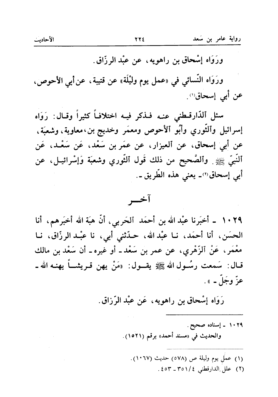 وَرَوَاهُ إِسْحَاق بن رَاهَوَيْه عَن عبد الرَّزَّاق وَرَوَاهُ النَّسَائِيُّ فِي عَمَلِ يَوْمٍ وَلَيْلَةٍ عَنْ قُتَيْبَةَ عَنْ أَبِي الأَحْوَصِ عَنْ أَبِي إِسْحَاقَ سُئِلَ الدَّارَقُطْنِيُّ عَنْهُ فَذَكَرَ فِيهِ اخْتِلافًا كَثِيرًا وَقَالَ رَوَاهُ إِسْرَائِيلُ وَالثَّوْرِيُّ وَأَبُو الأَحْوَصِ وَمَعْمَرٌ وَخَدِيجُ بْنُ مُعَاوِيَةَ وَشُعْبَةُ عَنْ أَبِي إِسْحَاقَ عَنِ الْعَيْزَارِ عَنْ عُمَرَ بْنِ سَعْدٍ عَنْ سَعْدٍ عَنِ النَّبِيِّ صَلَّى اللَّهُ عَلَيْهِ وَسَلَّمَ وَالصَّحِيحُ مِنْ ذَلِكَ قَوْلُ الثَّوْرِيِّ وَشُعْبَةَ وَإِسْرَائِيلَ عَن أبي إِسْحَاق يَعْنِي هَذِه الطَّرِيق (إِسْنَاده صَحِيح)