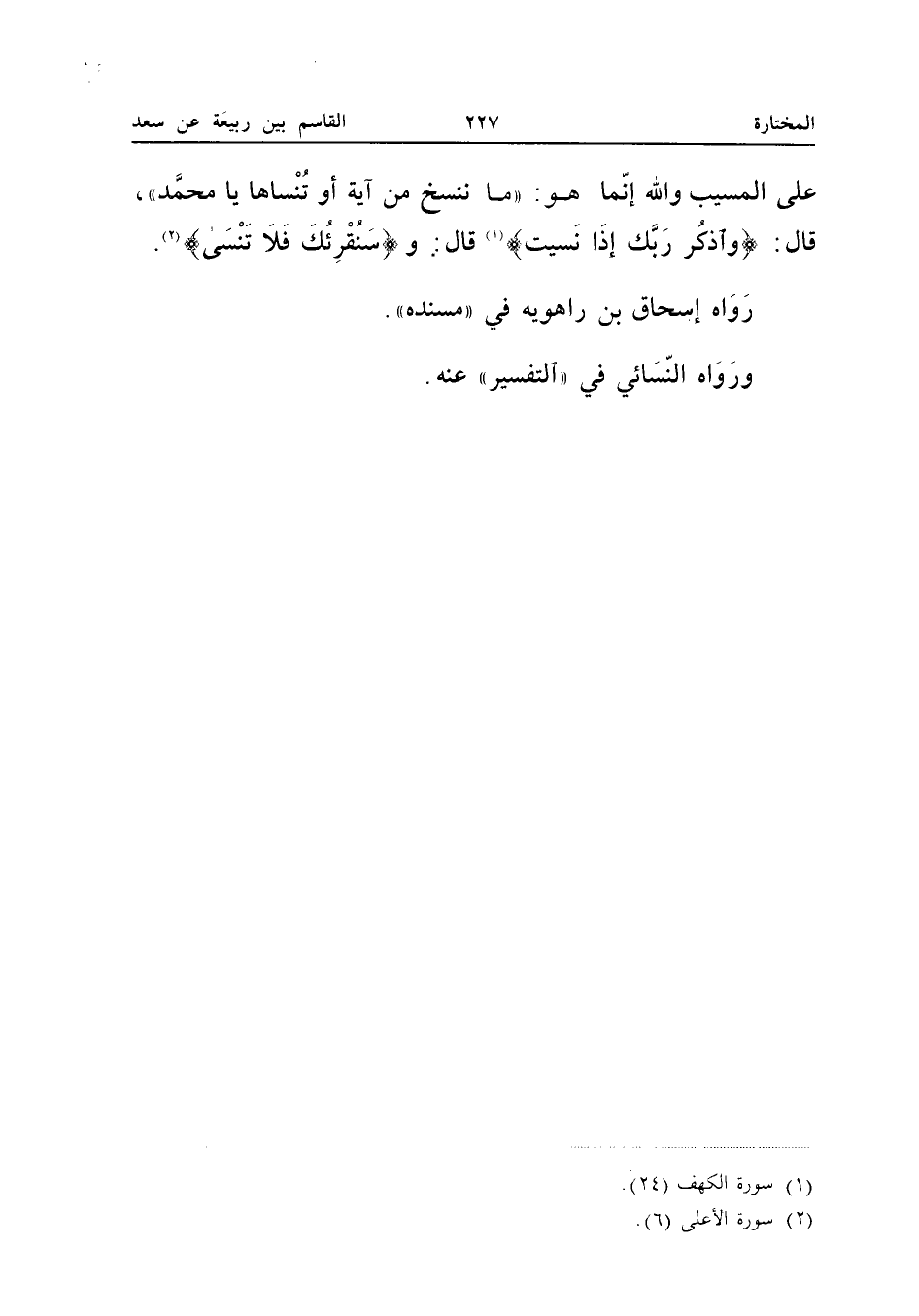 عَلَى الْمُسَيِّبِ وَاللَّهِ إِنَّمَا هُوَ مَا نَنْسَخُ مِنْ آيَةٍ أَوْ تَنْسَاهَا يَا مُحَمَّدُ قَالَ {وَاذْكُر رَبك إِذا نسيت} قَالَ و {سنقرئك فَلَا تنسى} رَوَاهُ إِسْحَاق بن ر فِي مُسْنَدِهِ وَرَوَاهُ النَّسَائِيُّ فِي التَّفْسِيرِ عَنْهُ (إِسْنَاده حسن)